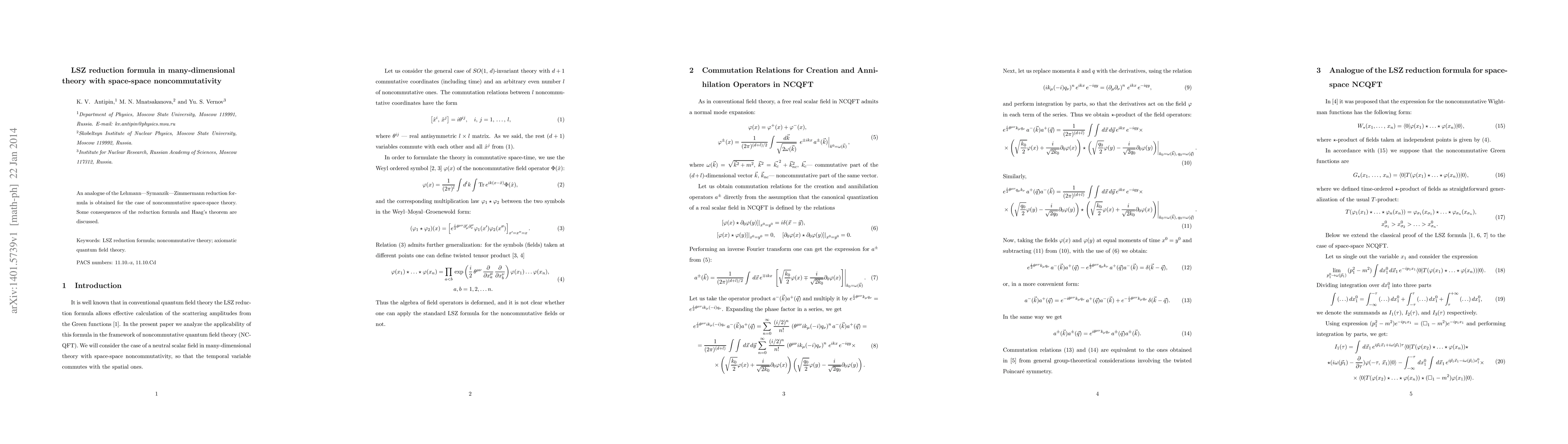 An analogue of the Lehmann-Symanzik-Zimmermann reduction formula is obtained for the case of noncommutative space-space theory. Some consequences of the reduction formula and Haag's theorem are discussed.