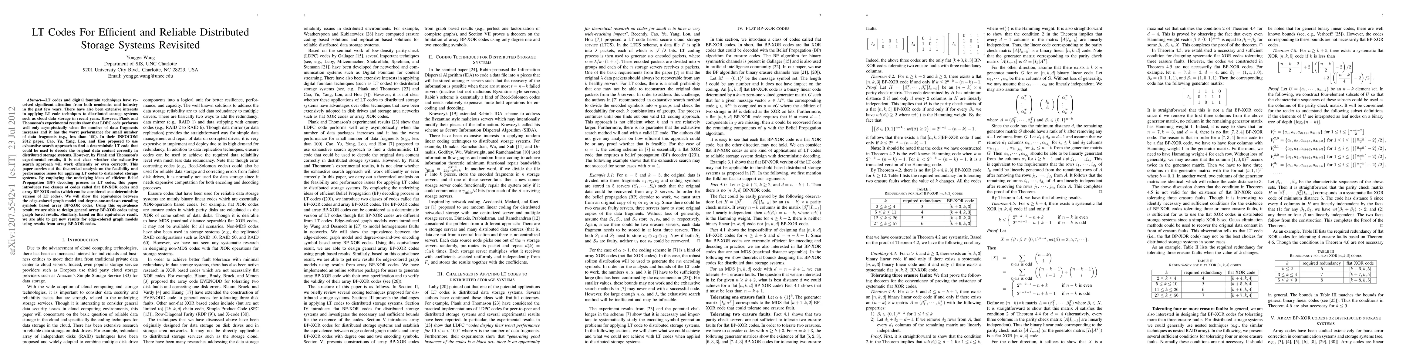 This paper revisits the application of LT codes in distributed storage systems, proposing two new classes of codes: flat BP-XOR codes and array BP-XOR codes. It demonstrates the equivalence between edge-colored graph models and array BP-XOR codes, enabling the design of efficient and reliable distributed storage solutions.
