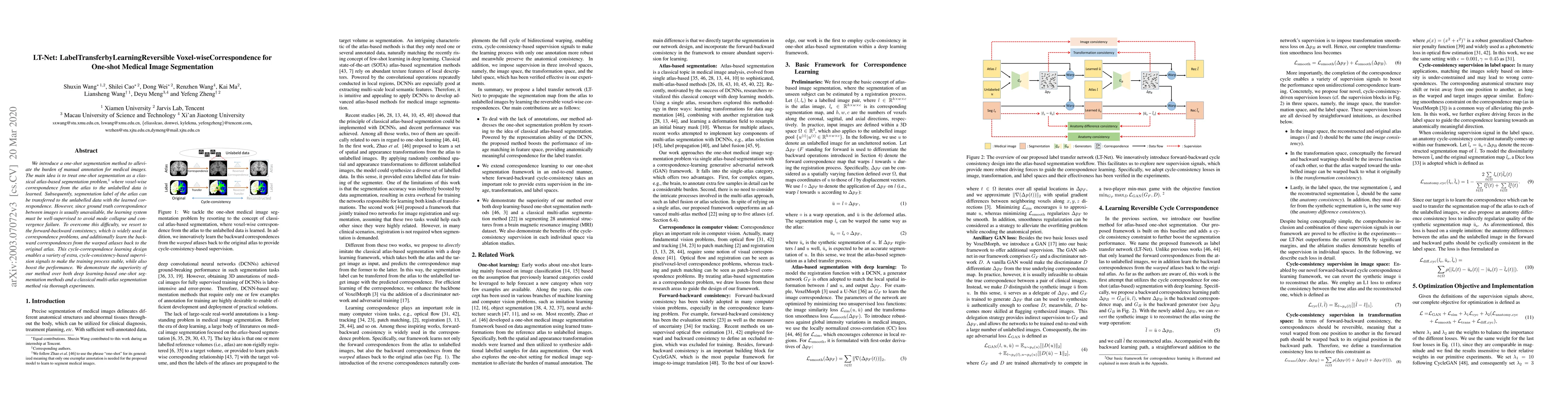 LT-Net introduces a one-shot segmentation method for medical images using reversible voxel-wise correspondence, leveraging forward-backward consistency to stabilize training and enhance performance. The method outperforms both deep learning-based and classical multi-atlas segmentation techniques.