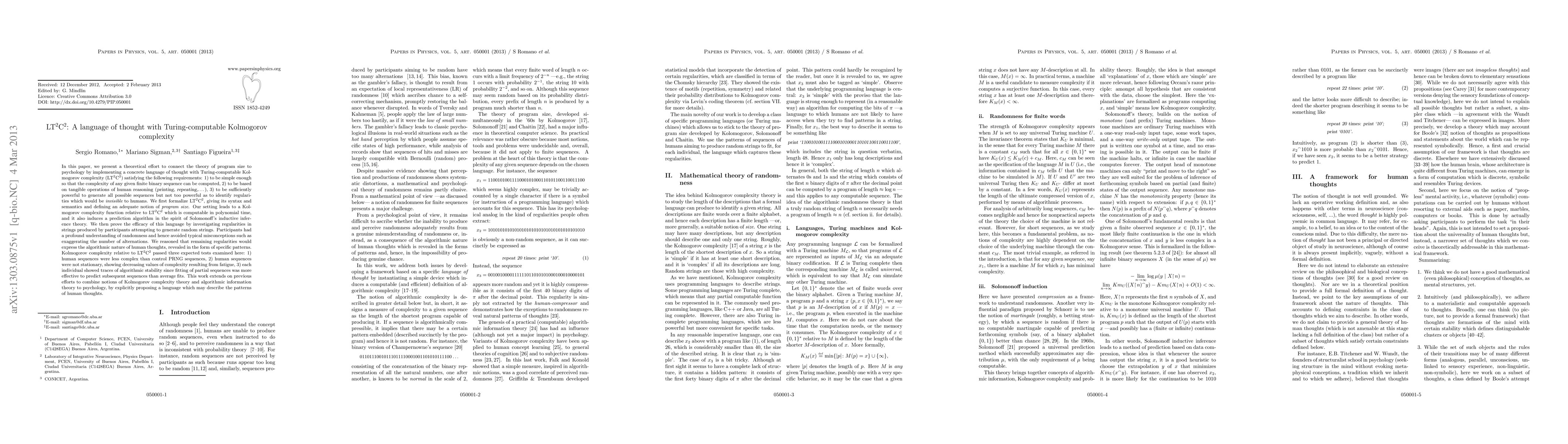 In this paper, we present a theoretical effort to connect the theory of program size to psychology by implementing a concrete language of thought with Turing-computable Kolmogorov complexity (LT^2C^2) satisfying the following requirements: 1) to be simple enough so that the complexity of any given finite binary sequence can be computed, 2) to be based on tangible operations of human reasoning (printing, repeating,...), 3) to be sufficiently powerful to generate all possible sequences but not too powerful as to identify regularities which would be invisible to humans. We first formalize LT^2C^2, giving its syntax and semantics and defining an adequate notion of program size. Our setting leads to a Kolmogorov complexity function relative to LT^2C^2 which is computable in polynomial time, and it also induces a prediction algorithm in the spirit of Solomonoff's inductive inference theory. We then prove the efficacy of this language by investigating regularities in strings produced by participants attempting to generate random strings. Participants had a profound understanding of randomness and hence avoided typical misconceptions such as exaggerating the number of alternations. We reasoned that remaining regularities would express the algorithmic nature of human thoughts, revealed in the form of specific patterns. Kolmogorov complexity relative to LT^2C^2 passed three expected tests examined here: 1) human sequences were less complex than control PRNG sequences, 2) human sequences were not stationary, showing decreasing values of complexity resulting from fatigue, 3) each individual showed traces of algorithmic stability since fitting of partial sequences was more effective to predict subsequent sequences than average fits. This work extends on previous efforts to combine notions of Kolmogorov complexity theory and algorithmic information theory to psychology, by explicitly ...