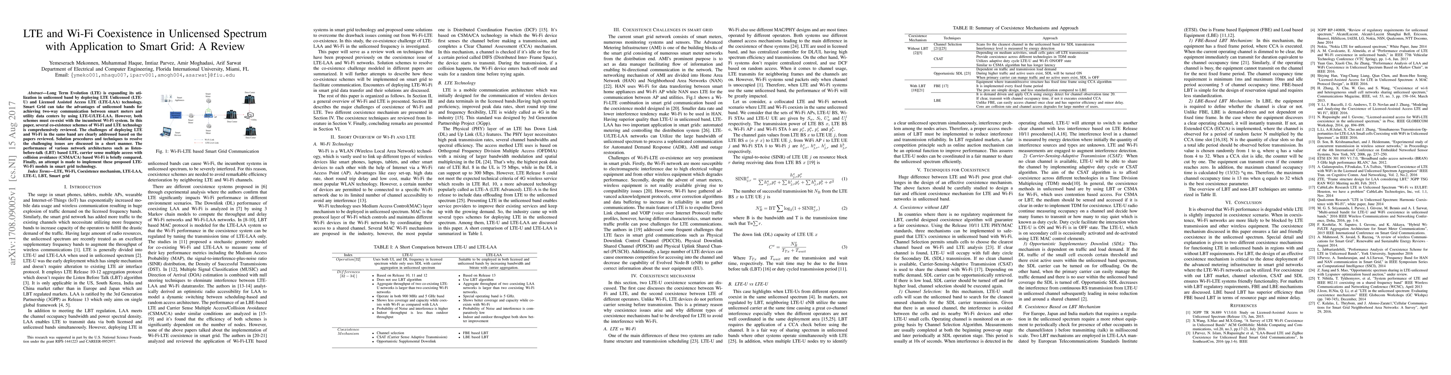 This paper reviews coexistence strategies for LTE and Wi-Fi in unlicensed spectrum, focusing on smart grid applications. It discusses challenges and solutions for deploying LTE-U/LTE-LAA alongside Wi-Fi, comparing network architectures like LBT and CSMA/CA, and explores their implementation in smart grid technology.