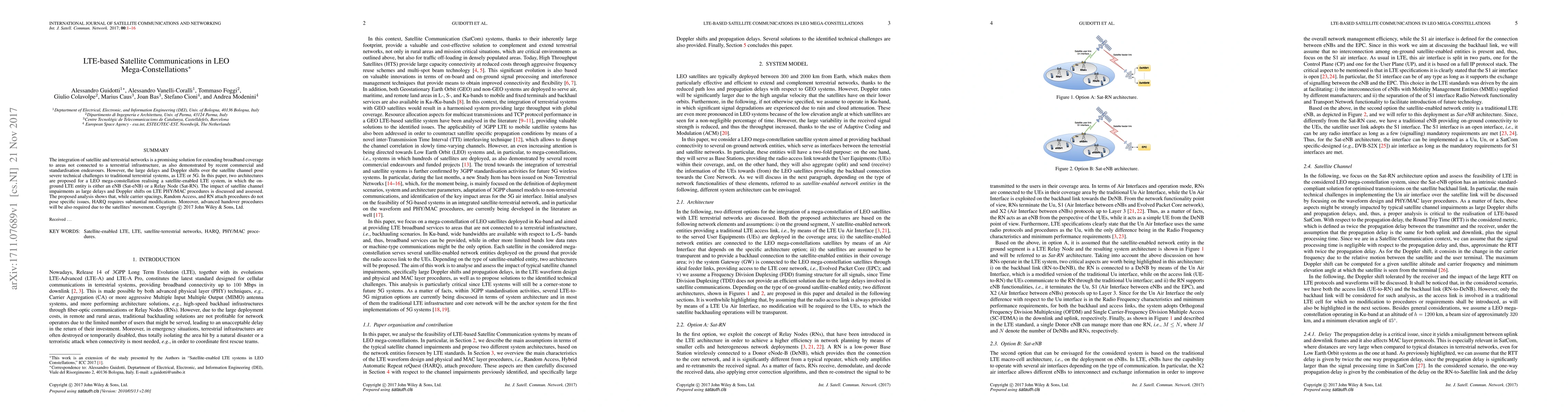 This paper proposes two architectures for LTE-based satellite communications in LEO mega-constellations, addressing the challenges of large delays and Doppler shifts. It finds that while some LTE procedures remain feasible, HARQ and handover processes require significant modifications to accommodate satellite channel impairments.