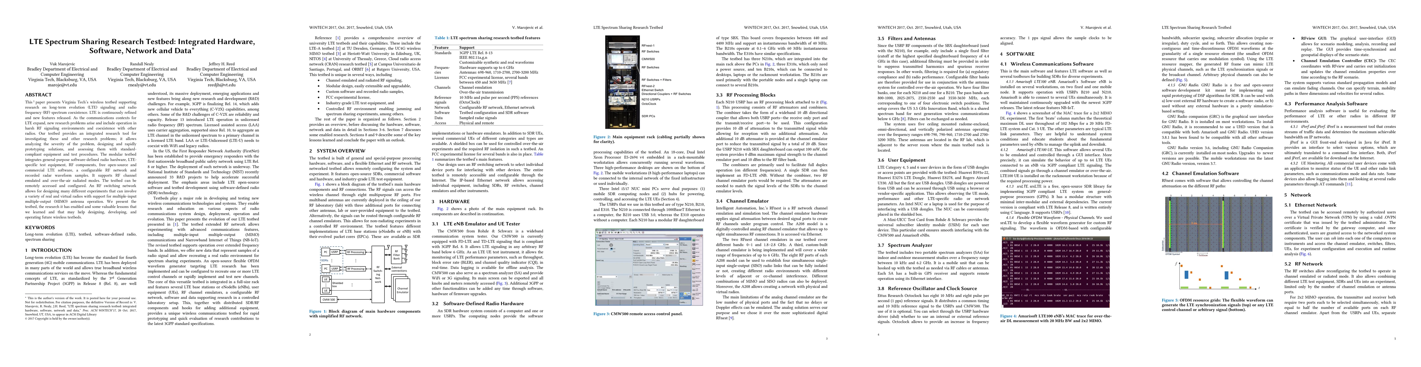 This paper introduces Virginia Tech's comprehensive LTE spectrum sharing research testbed, integrating hardware, software, network, and data components to study LTE signaling and RF coexistence. The modular testbed supports remote access, diverse experiment configurations, and MIMO operations, facilitating rapid prototyping and assessment of LTE solutions in various RF environments.