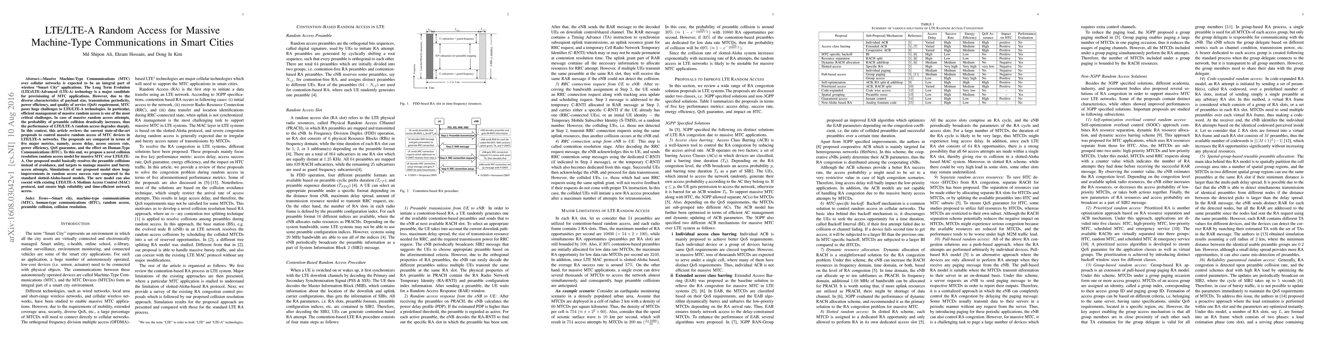 This paper reviews state-of-the-art proposals for managing massive random access in LTE/LTE-A networks for Smart City applications, focusing on MTC devices. It proposes a novel collision resolution model that significantly improves random access success rates and maintains high reliability and efficiency, outperforming standard slotted-Aloha-based methods.