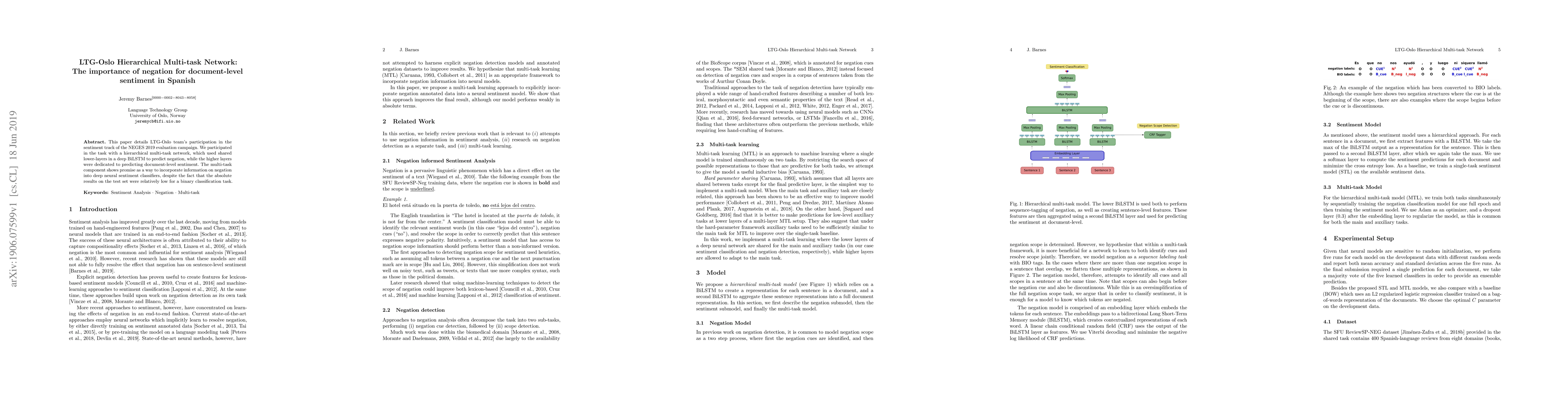 This paper presents LTG-Oslo's hierarchical multi-task network for the NEGES 2019 sentiment analysis challenge, emphasizing the role of negation in Spanish document-level sentiment. The model uses shared lower layers to predict negation and higher layers for sentiment, showing potential despite relatively low binary classification results.