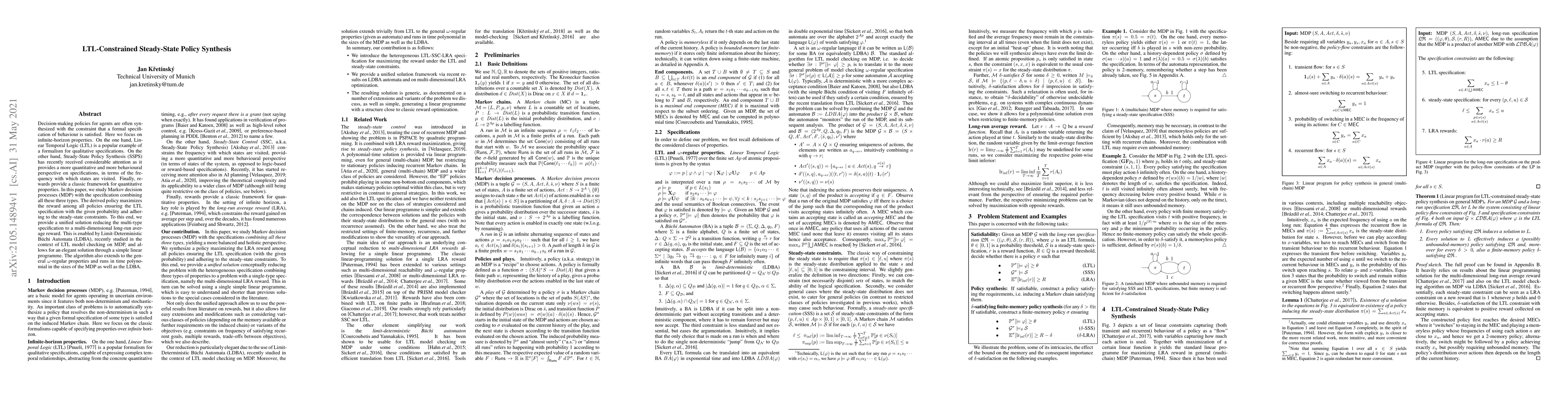 Decision-making policies for agents are often synthesized with the constraint that a formal specification of behaviour is satisfied. Here we focus on infinite-horizon properties. On the one hand, Linear Temporal Logic (LTL) is a popular example of a formalism for qualitative specifications. On the other hand, Steady-State Policy Synthesis (SSPS) has recently received considerable attention as it provides a more quantitative and more behavioural perspective on specifications, in terms of the frequency with which states are visited. Finally, rewards provide a classic framework for quantitative properties. In this paper, we study Markov decision processes (MDP) with the specification combining all these three types. The derived policy maximizes the reward among all policies ensuring the LTL specification with the given probability and adhering to the steady-state constraints. To this end, we provide a unified solution reducing the multi-type specification to a multi-dimensional long-run average reward. This is enabled by Limit-Deterministic B\"uchi Automata (LDBA), recently studied in the context of LTL model checking on MDP, and allows for an elegant solution through a simple linear programme. The algorithm also extends to the general $\omega$-regular properties and runs in time polynomial in the sizes of the MDP as well as the LDBA.