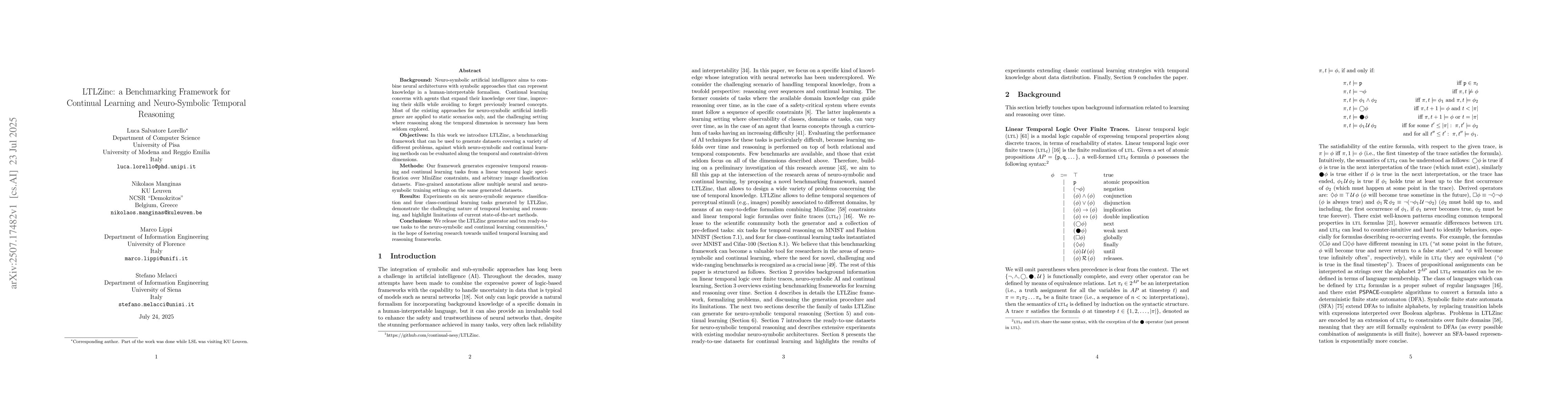 Neuro-symbolic artificial intelligence aims to combine neural architectures with symbolic approaches that can represent knowledge in a human-interpretable formalism. Continual learning concerns with agents that expand their knowledge over time, improving their skills while avoiding to forget previously learned concepts. Most of the existing approaches for neuro-symbolic artificial intelligence are applied to static scenarios only, and the challenging setting where reasoning along the temporal dimension is necessary has been seldom explored. In this work we introduce LTLZinc, a benchmarking framework that can be used to generate datasets covering a variety of different problems, against which neuro-symbolic and continual learning methods can be evaluated along the temporal and constraint-driven dimensions. Our framework generates expressive temporal reasoning and continual learning tasks from a linear temporal logic specification over MiniZinc constraints, and arbitrary image classification datasets. Fine-grained annotations allow multiple neural and neuro-symbolic training settings on the same generated datasets. Experiments on six neuro-symbolic sequence classification and four class-continual learning tasks generated by LTLZinc, demonstrate the challenging nature of temporal learning and reasoning, and highlight limitations of current state-of-the-art methods. We release the LTLZinc generator and ten ready-to-use tasks to the neuro-symbolic and continual learning communities, in the hope of fostering research towards unified temporal learning and reasoning frameworks.