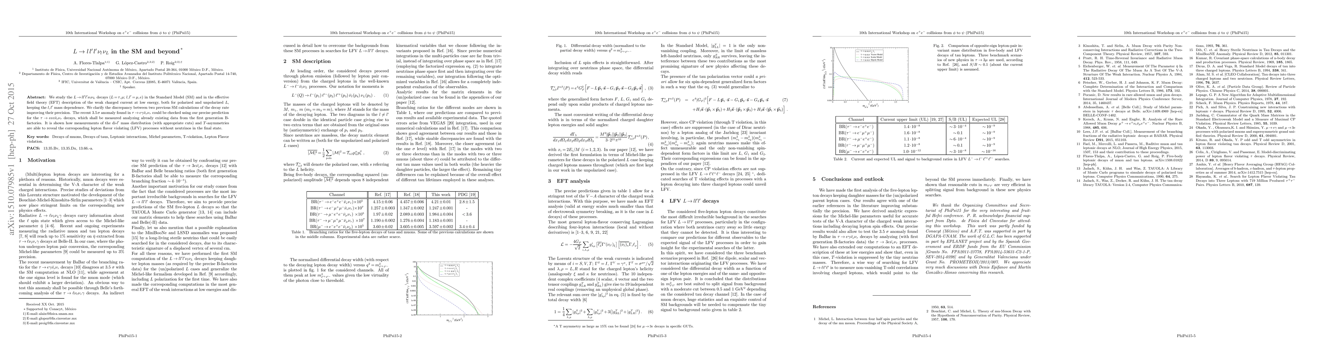 We study the $L\to l l' l' \nu_l \nu_L$ decays ($L=\tau,\mu$; $l,l'=\mu,e$) in the Standard Model (SM) and in the effective field theory (EFT) description of the weak charged current at low energy, both for polarized and unpolarized $L$, keeping the $l,l'$ mass dependence. We clarify the discrepancy between two previous SM calculations of the decay rate improving their precision. The recent $3.5\,\sigma$ anomaly found in $\tau\to e \gamma\bar{\nu}_e\nu_\tau$ could be checked using our precise prediction for the $\tau\to e e e \bar{\nu}_e\nu_\tau$ decays, which shall be measured analyzing already existing data from the first generation B-factories. It is shown how measurements of the di-$l'$ mass distribution (with appropriate cuts) and $T$-asymmetries are able to reveal the corresponding lepton flavor violating (LFV) processes without neutrinos in the final state.
