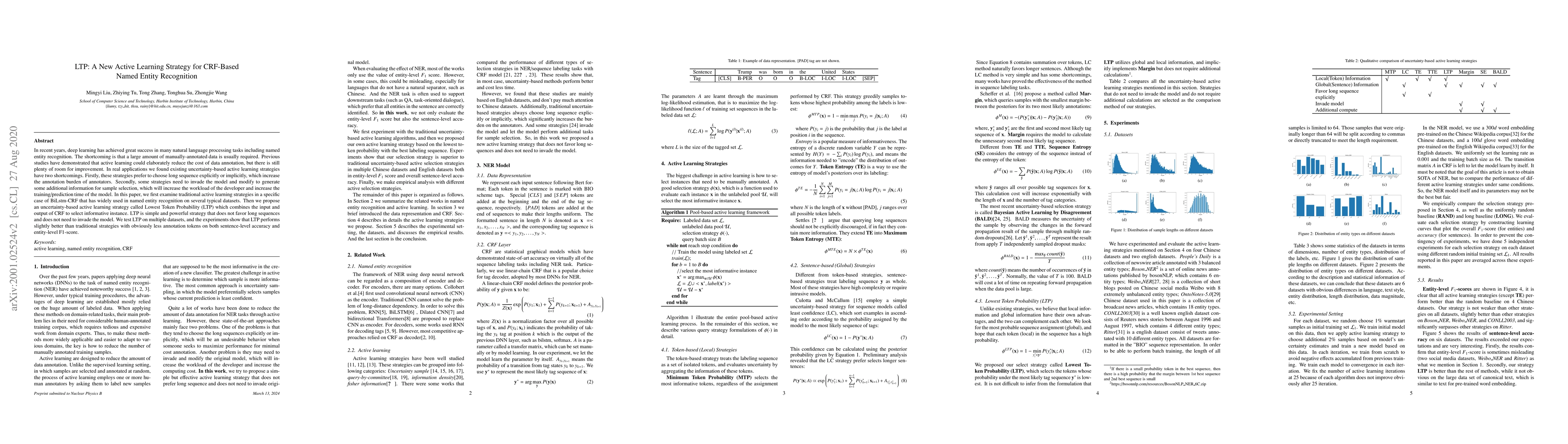 This paper proposes an active learning strategy called Lowest Token Probability (LTP) for CRF-based named entity recognition, aiming to reduce annotation costs. Unlike existing uncertainty-based strategies, LTP does not favor long sequences and does not require model modifications, leading to better performance and lower annotation burdens.