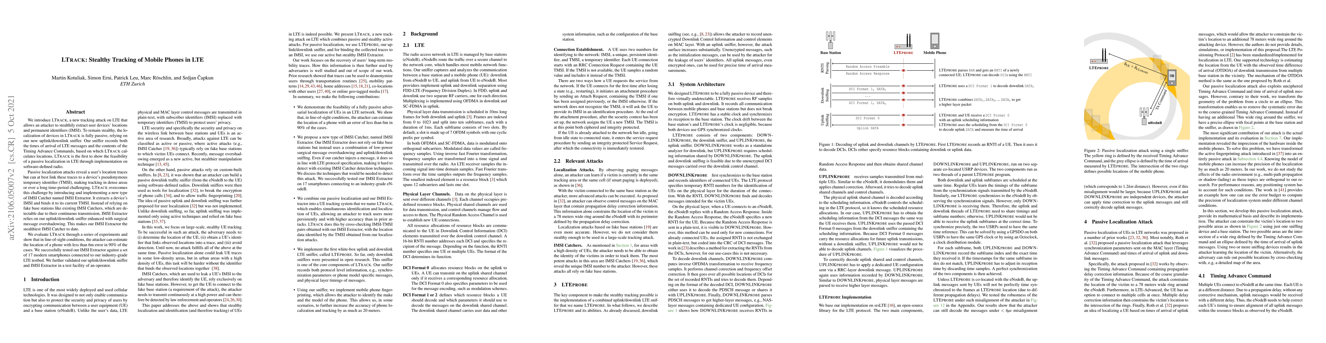 LTrack is a stealthy tracking attack on LTE networks that allows attackers to extract user devices' locations and permanent identifiers (IMSI) passively. It employs an uplink/downlink sniffer to record LTE message timings and Timing Advance Commands, enabling precise passive localization and the extraction of IMSI through an innovative IMSI Extractor, which avoids detection by using surgical message overshadowing.