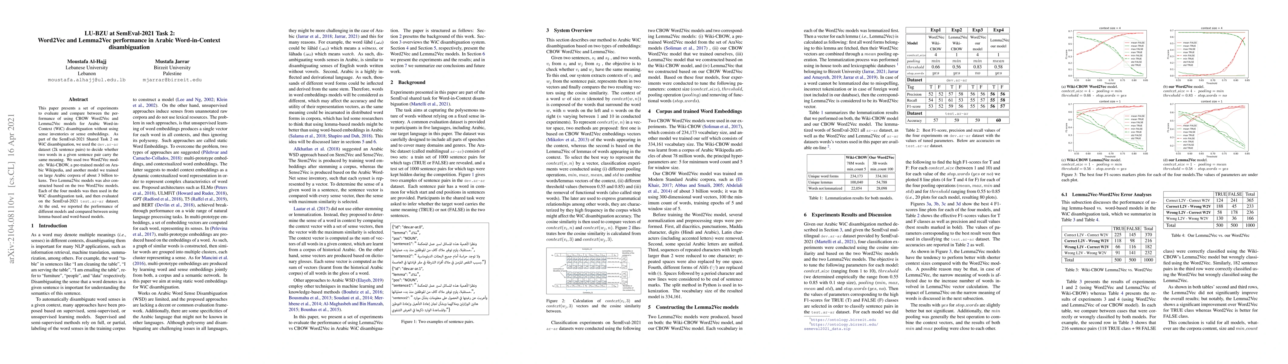 This paper evaluates CBOW Word2Vec and Lemma2Vec models for Arabic Word-in-Context disambiguation using the SemEval-2021 dataset, finding performance differences between lemma-based and word-based embeddings.