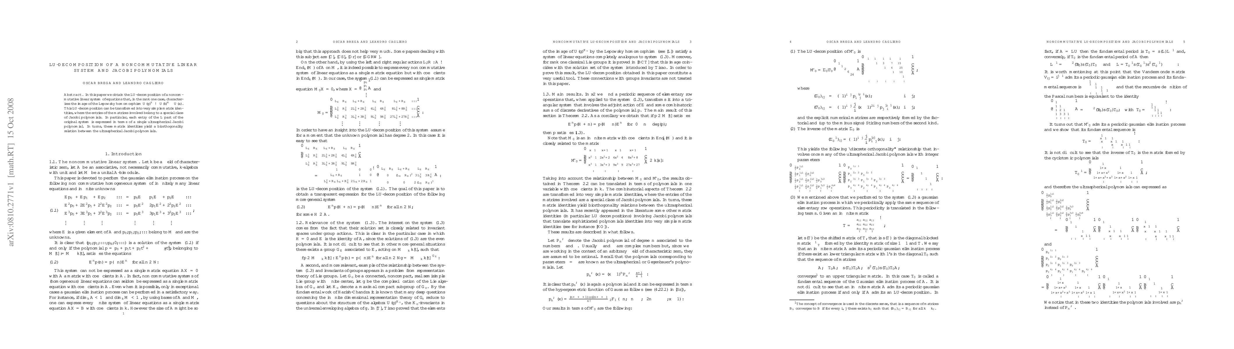 Researchers discovered a new way to solve noncommutative linear systems of equations using LU-decomposition, which can be expressed in terms of special polynomials called Jacobi polynomials. This breakthrough leads to a biorthogonality relation between these polynomials.