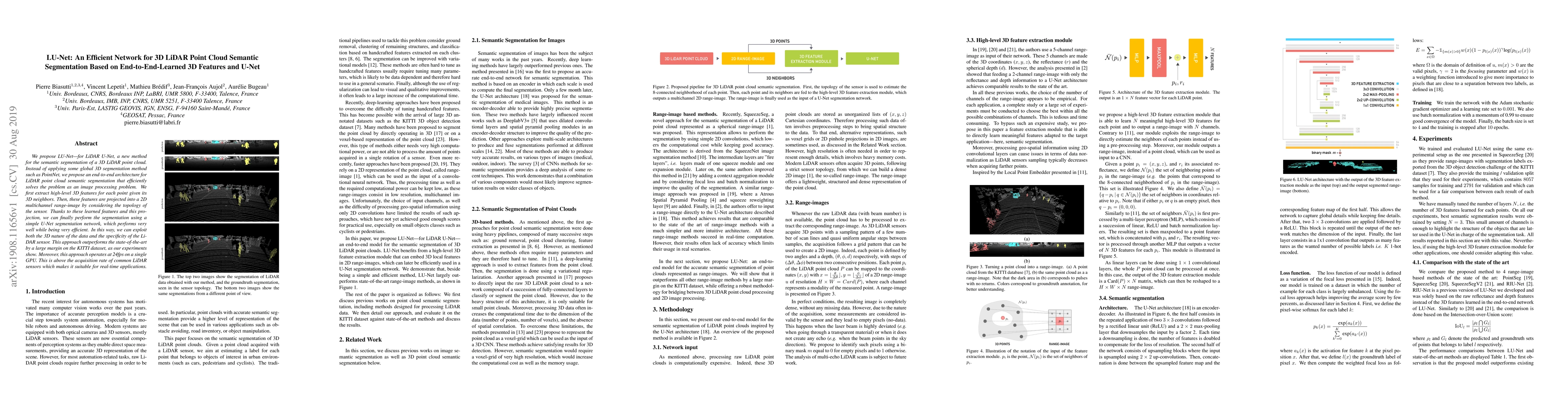 LU-Net is an efficient end-to-end network for 3D LiDAR point cloud semantic segmentation, transforming 3D features into 2D range-images for U-Net segmentation, achieving superior performance on the KITTI dataset and real-time operation at 24fps.