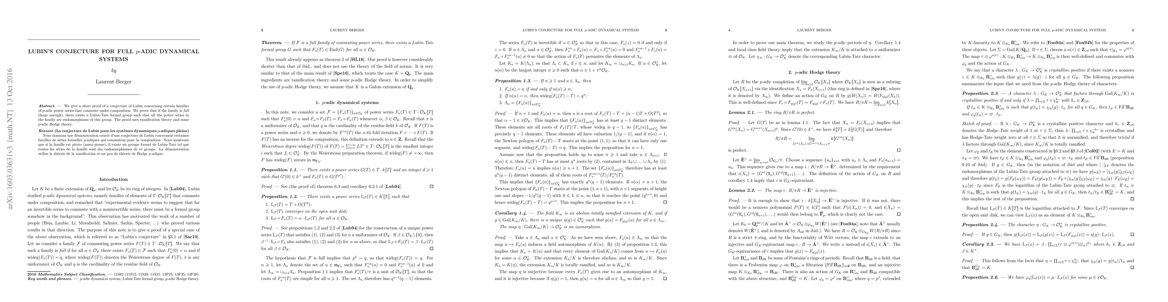Lubin's conjecture is proven for full $p$-adic dynamical systems, showing that large families of commuting $p$-adic power series correspond to endomorphisms of a Lubin-Tate formal group. The proof leverages ramification theory and $p$-adic Hodge theory.