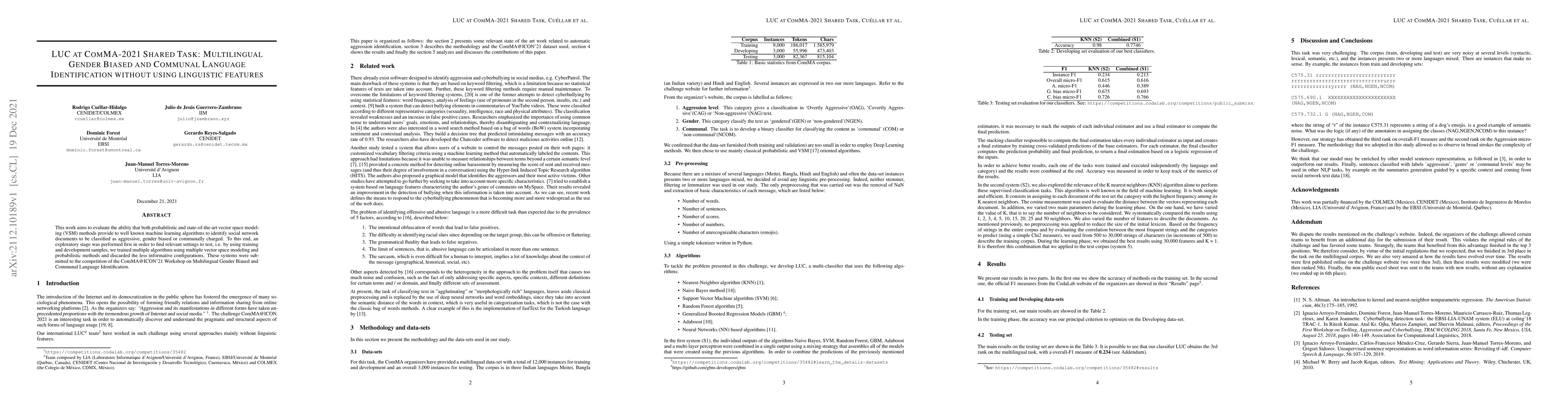 This work aims to evaluate the ability that both probabilistic and state-of-the-art vector space modeling (VSM) methods provide to well known machine learning algorithms to identify social network documents to be classified as aggressive, gender biased or communally charged. To this end, an exploratory stage was performed first in order to find relevant settings to test, i.e. by using training and development samples, we trained multiple algorithms using multiple vector space modeling and probabilistic methods and discarded the less informative configurations. These systems were submitted to the competition of the ComMA@ICON'21 Workshop on Multilingual Gender Biased and Communal Language Identification.