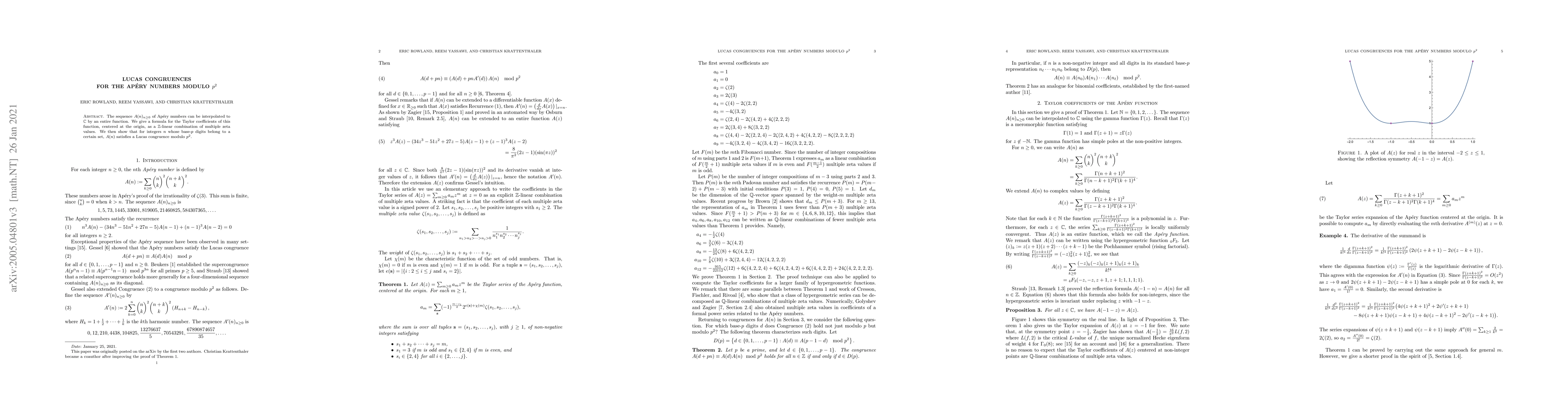 The paper presents a novel approach to expressing Taylor coefficients of the Apéry function using multiple zeta values and establishes Lucas congruences for Apéry numbers modulo $p^2$.