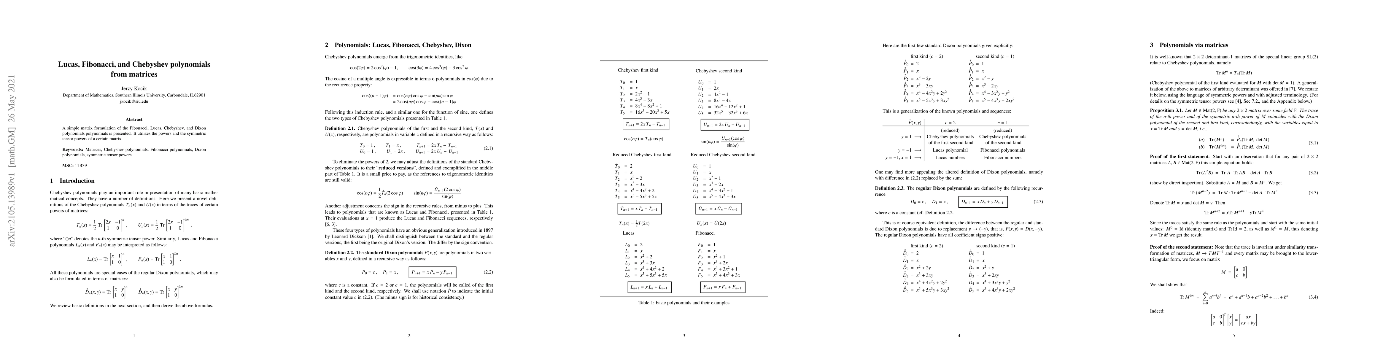 Summary: This paper introduces a matrix-based approach to represent Fibonacci, Lucas, Chebyshev, and Dixon polynomials through the powers and symmetric tensor powers of a specific matrix, offering a unified framework for these mathematical constructs.