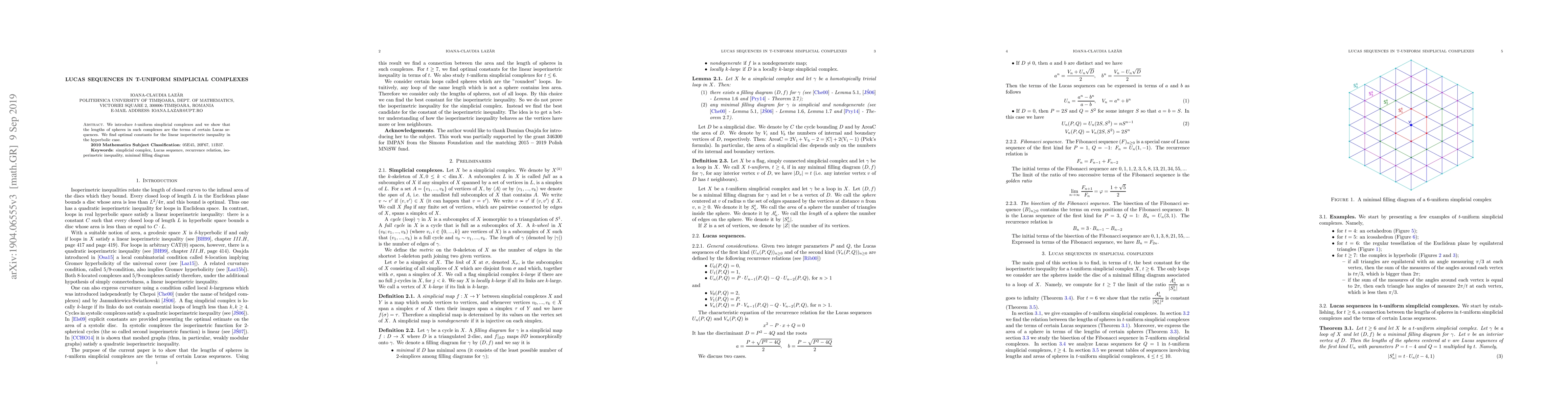 This paper introduces t-uniform simplicial complexes and demonstrates that sphere lengths in these complexes correspond to Lucas sequences. It also determines optimal constants for the linear isoperimetric inequality in the hyperbolic context.