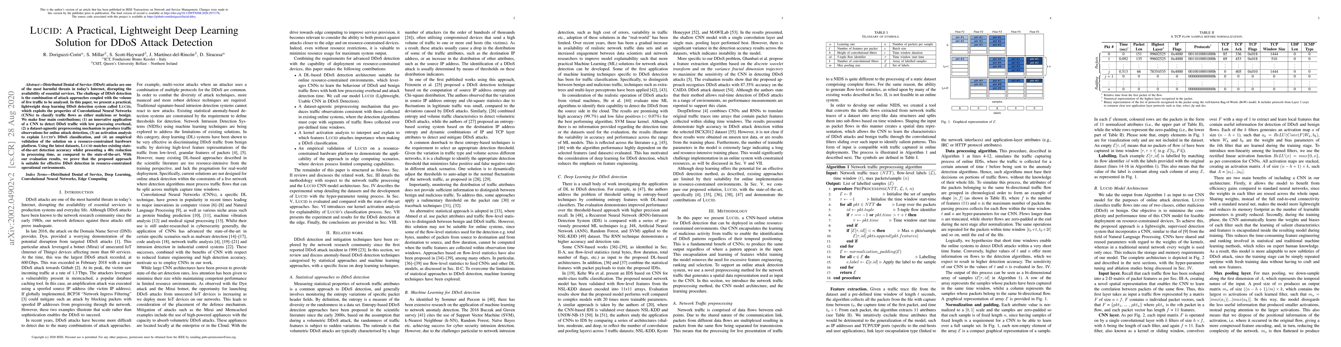 This paper introduces LUCID, a practical, lightweight deep learning solution for detecting Distributed Denial of Service (DDoS) attacks using Convolutional Neural Networks (CNNs). The authors highlight its low processing overhead, dataset-agnostic preprocessing, and empirical validation on resource-constrained hardware, demonstrating a significant reduction in processing time compared to existing methods.