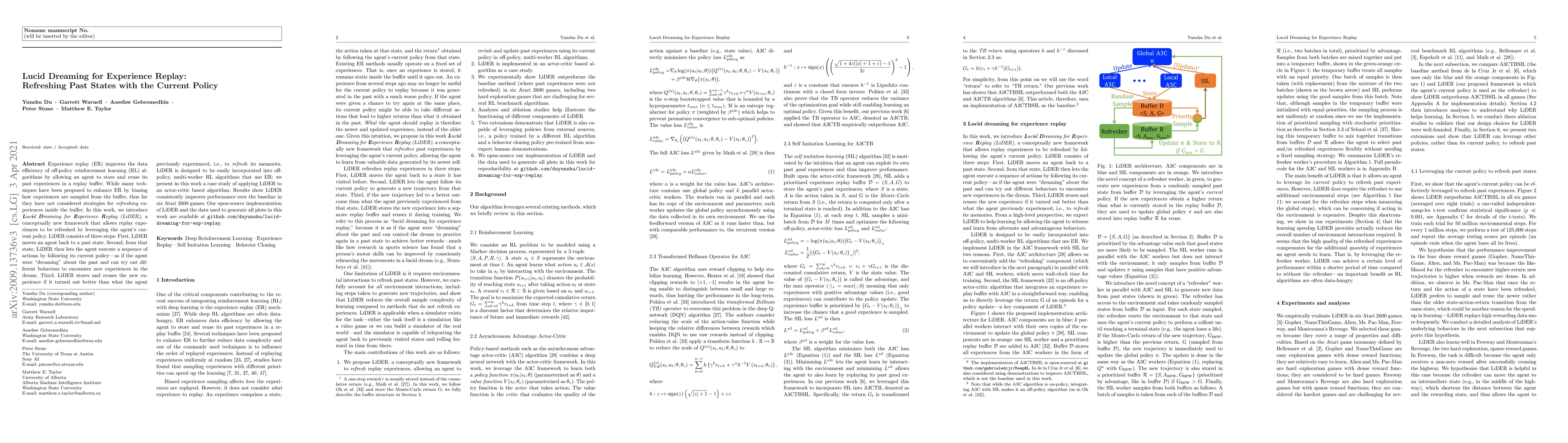 Experience replay (ER) improves the data efficiency of off-policy reinforcement learning (RL) algorithms by allowing an agent to store and reuse its past experiences in a replay buffer. While many techniques have been proposed to enhance ER by biasing how experiences are sampled from the buffer, thus far they have not considered strategies for refreshing experiences inside the buffer. In this work, we introduce Lucid Dreaming for Experience Replay (LiDER), a conceptually new framework that allows replay experiences to be refreshed by leveraging the agent's current policy. LiDER consists of three steps: First, LiDER moves an agent back to a past state. Second, from that state, LiDER then lets the agent execute a sequence of actions by following its current policy -- as if the agent were "dreaming" about the past and can try out different behaviors to encounter new experiences in the dream. Third, LiDER stores and reuses the new experience if it turned out better than what the agent previously experienced, i.e., to refresh its memories. LiDER is designed to be easily incorporated into off-policy, multi-worker RL algorithms that use ER; we present in this work a case study of applying LiDER to an actor-critic based algorithm. Results show LiDER consistently improves performance over the baseline in six Atari 2600 games. Our open-source implementation of LiDER and the data used to generate all plots in this work are available at github.com/duyunshu/lucid-dreaming-for-exp-replay.