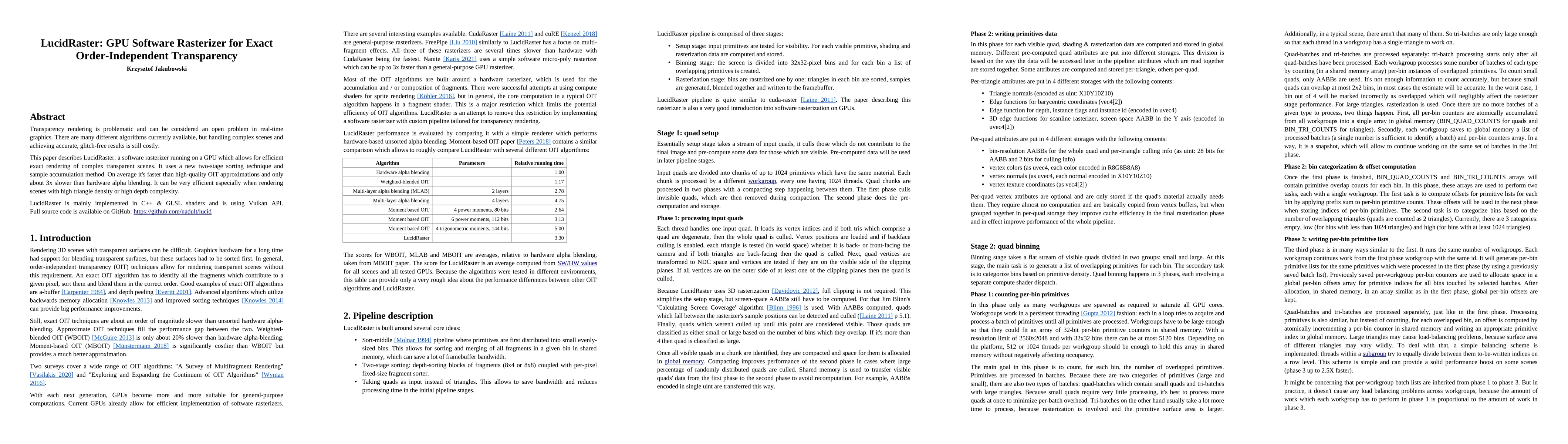LucidRaster is a GPU-based software rasterizer designed to efficiently render complex transparent scenes with exact order-independent transparency. It employs a two-stage sorting technique and sample accumulation, achieving results faster than high-quality approximations and about three times slower than hardware alpha blending.