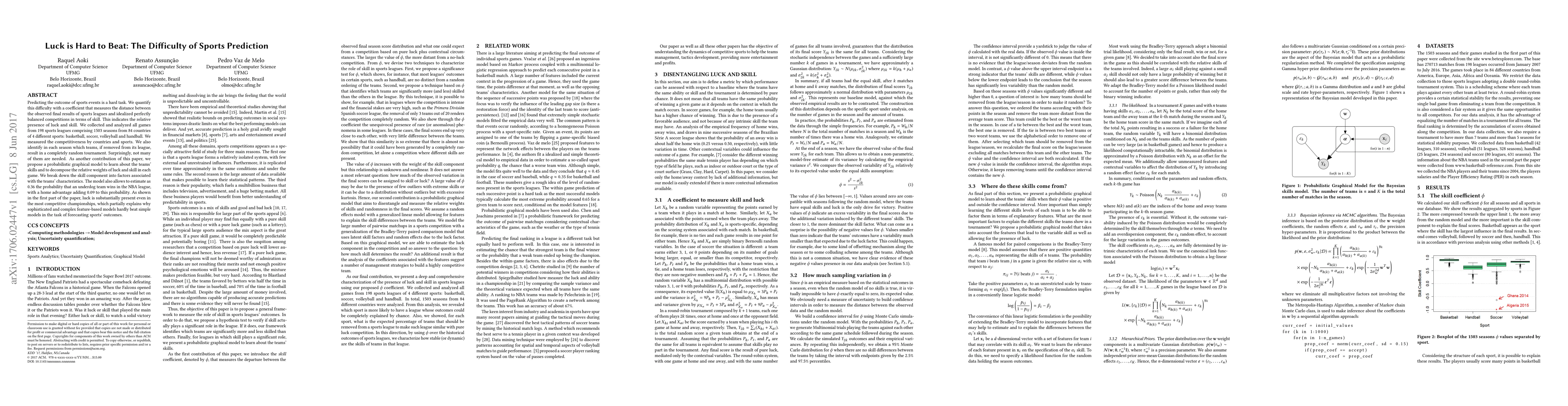 Predicting the outcome of sports events is a hard task. We quantify this difficulty with a coefficient that measures the distance between the observed final results of sports leagues and idealized perfectly balanced competitions in terms of skill. This indicates the relative presence of luck and skill. We collected and analyzed all games from 198 sports leagues comprising 1503 seasons from 84 countries of 4 different sports: basketball, soccer, volleyball and handball. We measured the competitiveness by countries and sports. We also identify in each season which teams, if removed from its league, result in a completely random tournament. Surprisingly, not many of them are needed. As another contribution of this paper, we propose a probabilistic graphical model to learn about the teams' skills and to decompose the relative weights of luck and skill in each game. We break down the skill component into factors associated with the teams' characteristics. The model also allows to estimate as 0.36 the probability that an underdog team wins in the NBA league, with a home advantage adding 0.09 to this probability. As shown in the first part of the paper, luck is substantially present even in the most competitive championships, which partially explains why sophisticated and complex feature-based models hardly beat simple models in the task of forecasting sports' outcomes.