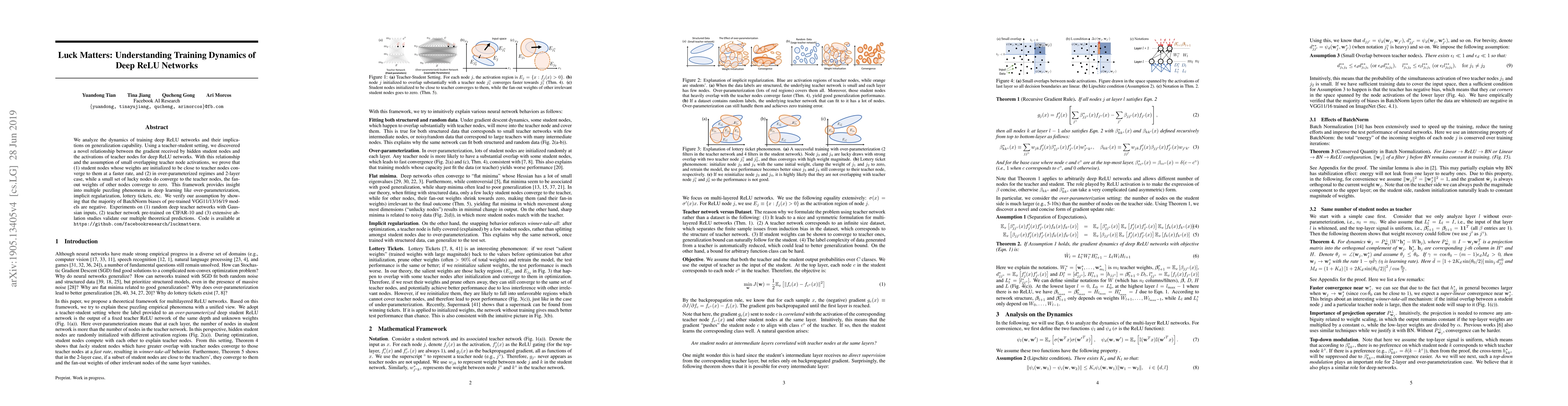 We analyze the dynamics of training deep ReLU networks and their implications on generalization capability. Using a teacher-student setting, we discovered a novel relationship between the gradient received by hidden student nodes and the activations of teacher nodes for deep ReLU networks. With this relationship and the assumption of small overlapping teacher node activations, we prove that (1) student nodes whose weights are initialized to be close to teacher nodes converge to them at a faster rate, and (2) in over-parameterized regimes and 2-layer case, while a small set of lucky nodes do converge to the teacher nodes, the fan-out weights of other nodes converge to zero. This framework provides insight into multiple puzzling phenomena in deep learning like over-parameterization, implicit regularization, lottery tickets, etc. We verify our assumption by showing that the majority of BatchNorm biases of pre-trained VGG11/16 models are negative. Experiments on (1) random deep teacher networks with Gaussian inputs, (2) teacher network pre-trained on CIFAR-10 and (3) extensive ablation studies validate our multiple theoretical predictions.