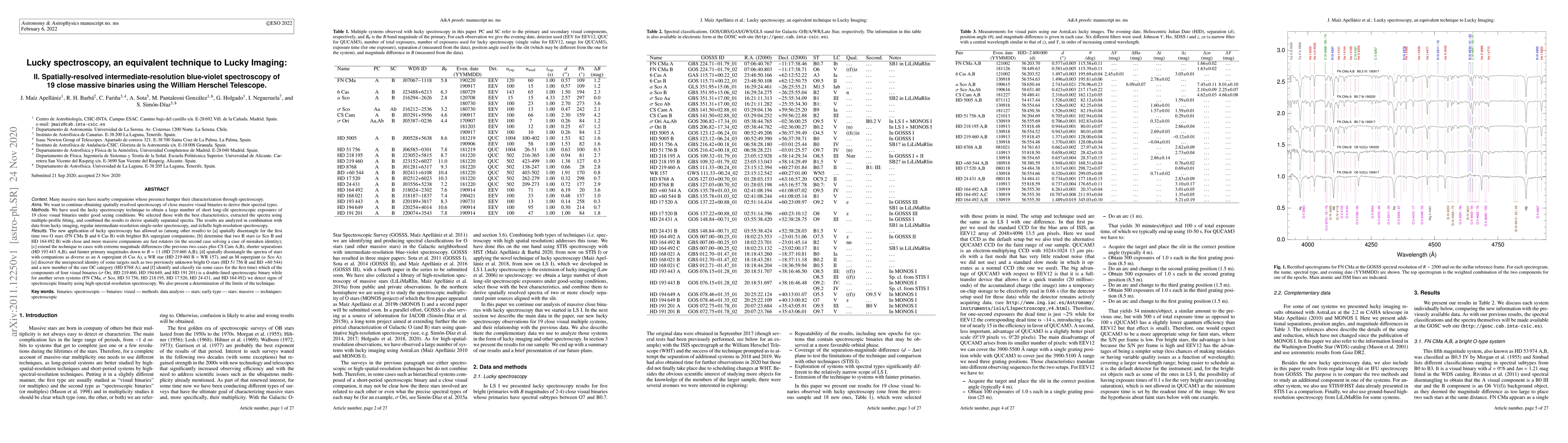 CONTEXT. Many massive stars have nearby companions whose presence hamper their characterization through spectroscopy. AIMS. We want to continue obtaining spatially resolved spectroscopy of close massive visual binaries to derive their spectral types. METHODS. We have used lucky spectroscopy to obtain many short long-slit spectroscopic exposures of 19 close visual binaries under good seeing conditions. We selected those with the best characteristics, extracted the spectra using multiple-profile fitting, and combined the results to derive spatially separated spectra. The results are analyzed in combination with data from lucky imaging, regular intermediate-resolution single-order spectroscopy, and \'echelle high-resolution spectroscopy. RESULTS. The new application of lucky spectroscopy has allowed us to [a] spatially disentangle for the first time two O stars (FN CMa B and 6 Cas B) with brighter BA supergiant companions; [b] determine that two B stars (alpha Sco B and HD 164492 B) with close and more massive companions are fast rotators; [c] extend the technique to cases with extreme magnitude differences, shorter separations, and fainter primary magnitudes down to B=11; [d] spatially disentangle the spectra of stars with companions as diverse as an A supergiant (6 Cas A), a WR star (WR 157), and an M supergiant (alpha Sco A); [e] discover the unexpected identity of some targets such as two previously unknown bright O stars (HD 51756 B and BD +60 544) and a new member of the rare OC category (HD 8768 A); and [f] identify and classify which of the components of four visual binaries is a double-lined spectroscopic binary and for another seven systems detect signs of spectroscopic binarity using high-spectral-resolution spectroscopy. We also present a determination of the limits of the technique. [ABRIDGED]