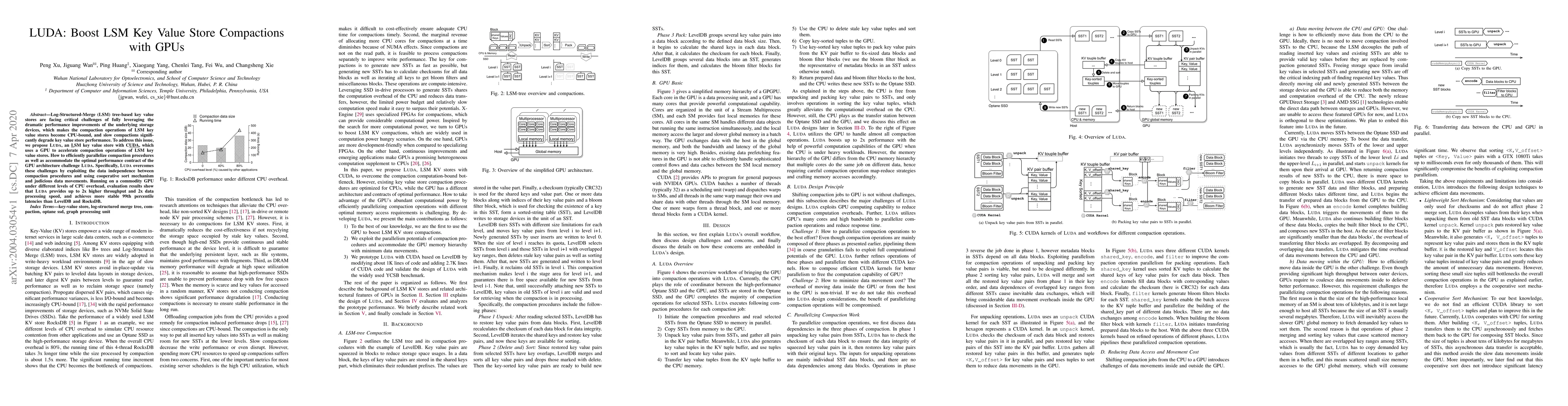 LUDA leverages GPUs to accelerate the compaction operations of LSM key value stores, addressing the CPU-bound nature of these operations. Evaluations demonstrate LUDA achieves up to 2x higher throughput and processing speed, and more stable latencies compared to LevelDB and RocksDB.