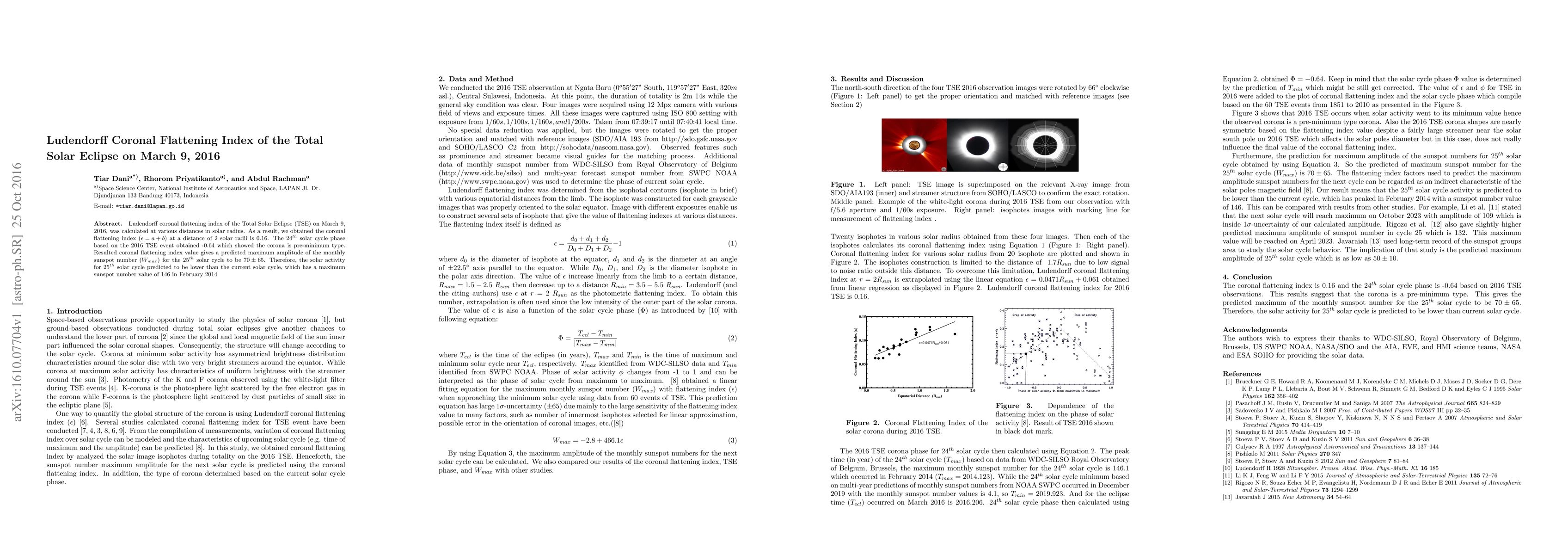 Ludendorff coronal flattening index of the Total Solar Eclipse (TSE) on March 9, 2016, was calculated at various distances in solar radius. As a result, we obtained the coronal flattening index $\left(\epsilon =a+b\right)$ at a distance of 2 solar radii is 0.16. The $24^{th}$ solar cycle phase based on the 2016 TSE event obtained -0.64 which showed the corona is pre-minimum type. Resulted coronal flattening index value gives a predicted maximum amplitude of the monthly sunspot number ($W_{max}$) for the $25^{th}$ solar cycle to be $70\pm65$. Therefore, the solar activity for $25^{th}$ solar cycle predicted to be lower than the current solar cycle, which has a maximum sunspot number value of 146 in February 2014