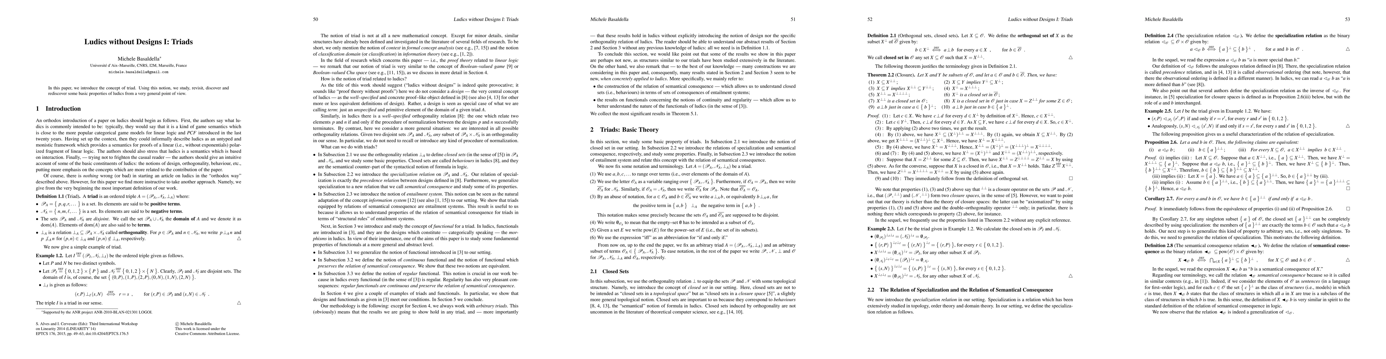 In this paper, we introduce the concept of triad. Using this notion, we study, revisit, discover and rediscover some basic properties of ludics from a very general point of view.