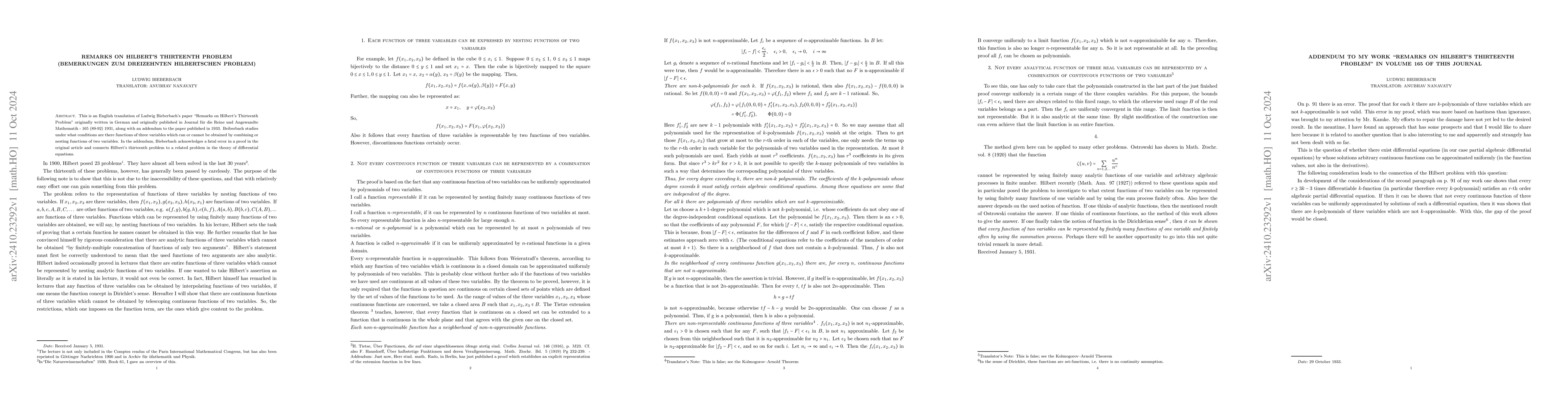 Summary: Ludwig Bieberbach translates and discusses the conditions under which functions of three variables can be represented using combinations of functions of two variables, correcting an error in his original proof and linking Hilbert's thirteenth problem to differential equations in an addendum.