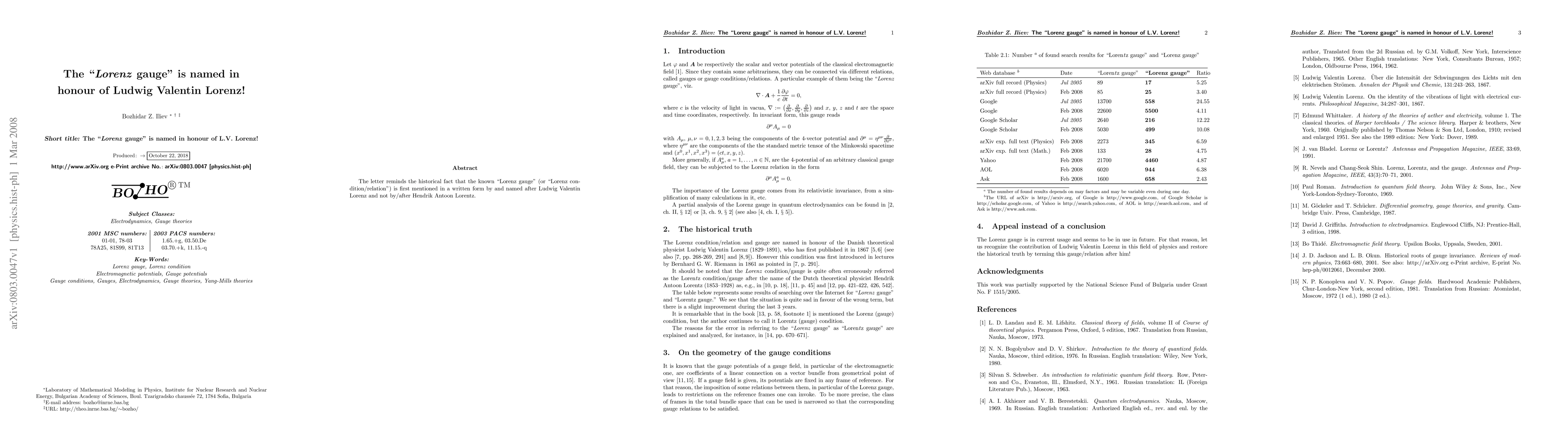 Summary: This paper clarifies the historical attribution of the "Lorenz gauge," asserting that it was first mentioned and named by Ludwig Valentin Lorenz, not Hendrik Antoon Lorentz. It corrects a common misconception regarding the origin of the term.