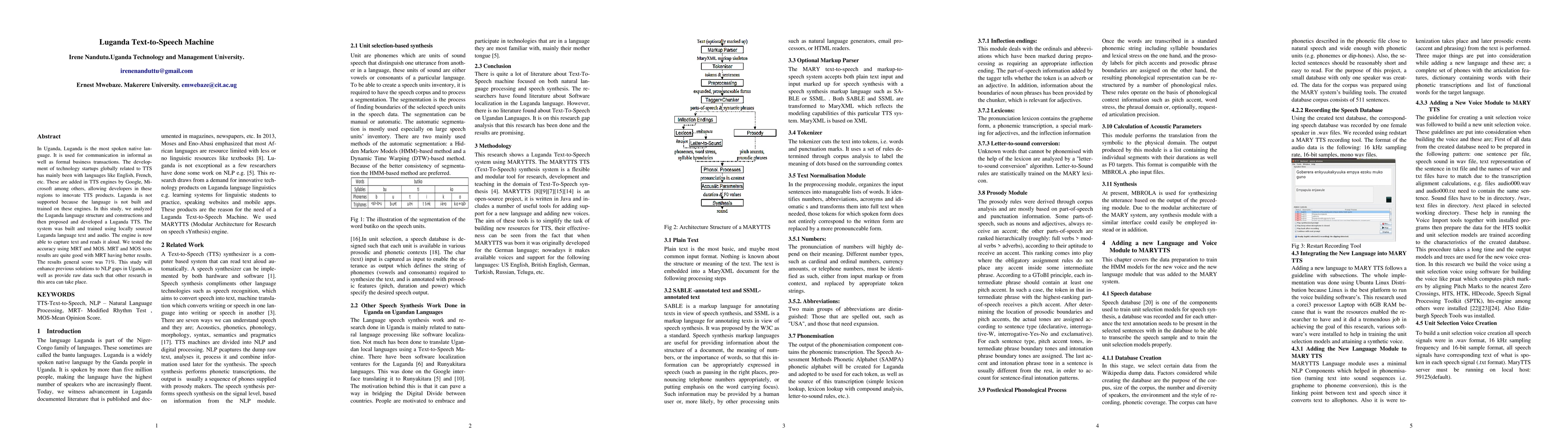 In Uganda, Luganda is the most spoken native language. It is used for communication in informal as well as formal business transactions. The development of technology startups globally related to TTS has mainly been with languages like English, French, etc. These are added in TTS engines by Google, Microsoft among others, allowing developers in these regions to innovate TTS products. Luganda is not supported because the language is not built and trained on these engines. In this study, we analyzed the Luganda language structure and constructions and then proposed and developed a Luganda TTS. The system was built and trained using locally sourced Luganda language text and audio. The engine is now able to capture text and reads it aloud. We tested the accuracy using MRT and MOS. MRT and MOS tests results are quite good with MRT having better results. The results general score was 71%. This study will enhance previous solutions to NLP gaps in Uganda, as well as provide raw data such that other research in this area can take place.