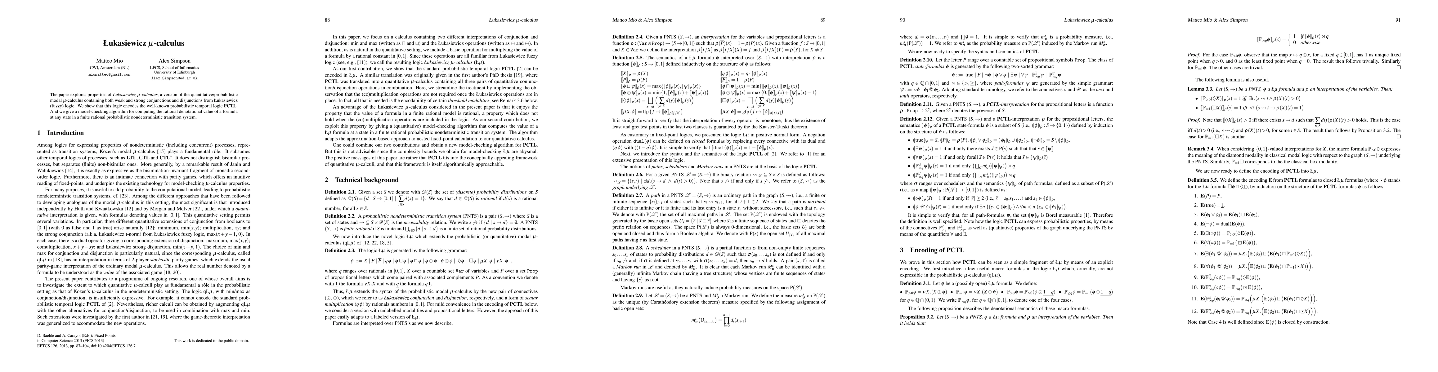 The paper investigates the properties of {\L}ukasiewicz mu-calculus, demonstrating its equivalence to probabilistic temporal logic PCTL, and provides a model-checking algorithm for evaluating rational denotational values within finite probabilistic systems.