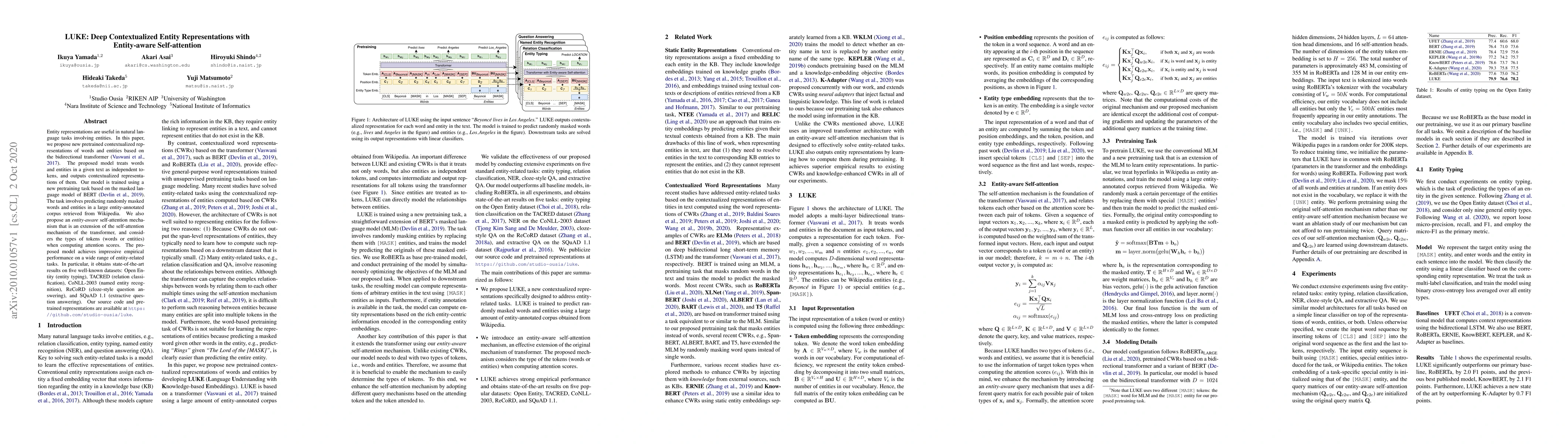 This paper introduces LUKE, a model for generating deep contextualized representations of both words and entities using an entity-aware self-attention mechanism. It achieves state-of-the-art results on several entity-related tasks, including entity typing, relation classification, and named entity recognition.