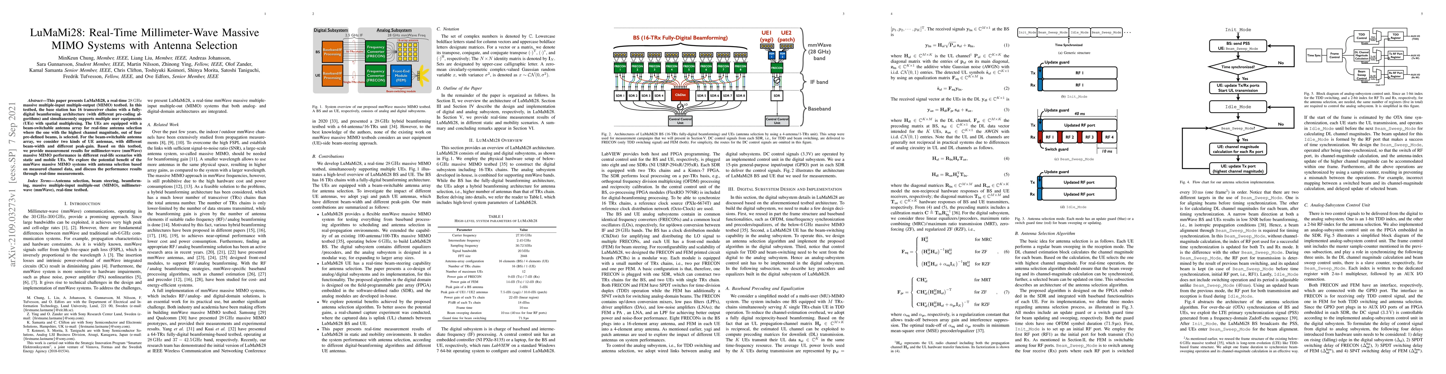 LuMaMi28 is a real-time 28 GHz massive MIMO testbed featuring 16 transceiver chains and real-time antenna selection for user equipment. The study provides measurement results on mmWave massive MIMO performance in various scenarios, highlighting the benefits of antenna selection.
