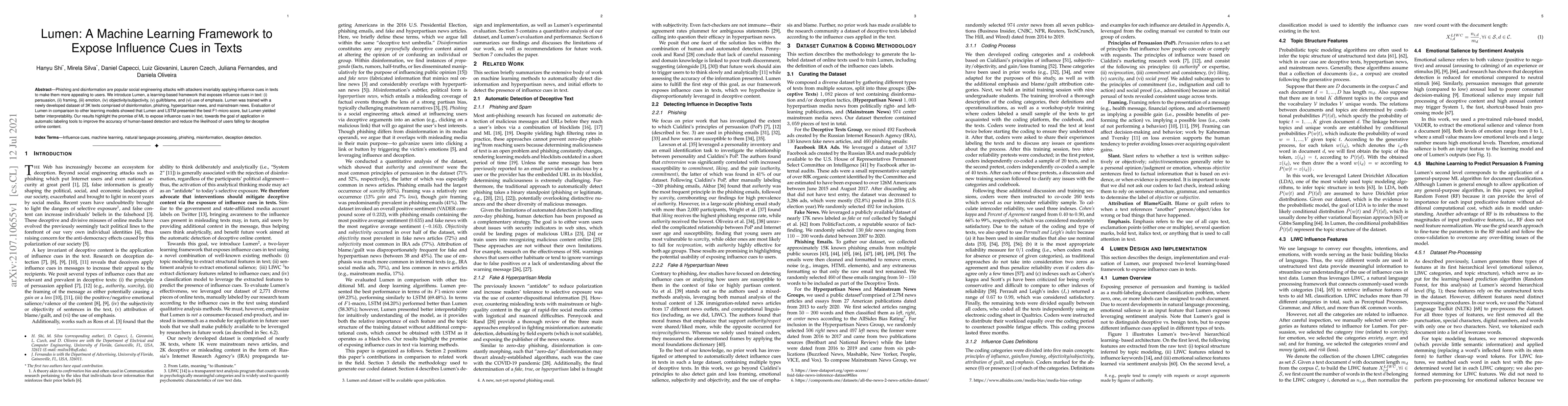 Phishing and disinformation are popular social engineering attacks with attackers invariably applying influence cues in texts to make them more appealing to users. We introduce Lumen, a learning-based framework that exposes influence cues in text: (i) persuasion, (ii) framing, (iii) emotion, (iv) objectivity/subjectivity, (v) guilt/blame, and (vi) use of emphasis. Lumen was trained with a newly developed dataset of 3K texts comprised of disinformation, phishing, hyperpartisan news, and mainstream news. Evaluation of Lumen in comparison to other learning models showed that Lumen and LSTM presented the best F1-micro score, but Lumen yielded better interpretability. Our results highlight the promise of ML to expose influence cues in text, towards the goal of application in automatic labeling tools to improve the accuracy of human-based detection and reduce the likelihood of users falling for deceptive online content.