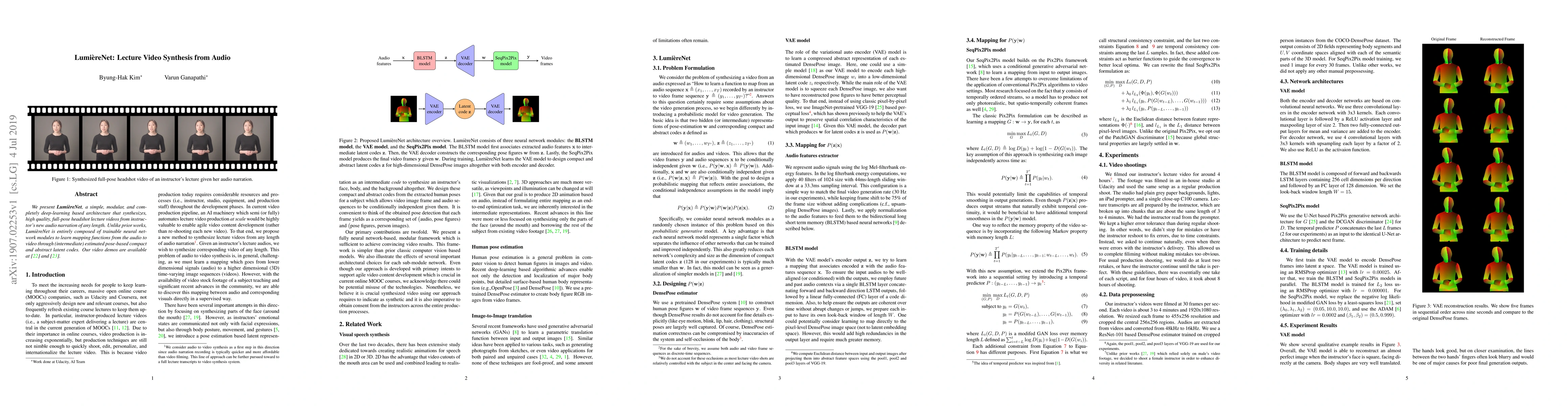Lumi ext{ereNet} synthesizes high-quality lecture videos from instructor audio narration using a simple and modular deep-learning architecture. It learns mapping functions through pose-based latent codes, enabling the creation of full-pose headshot videos of any length.