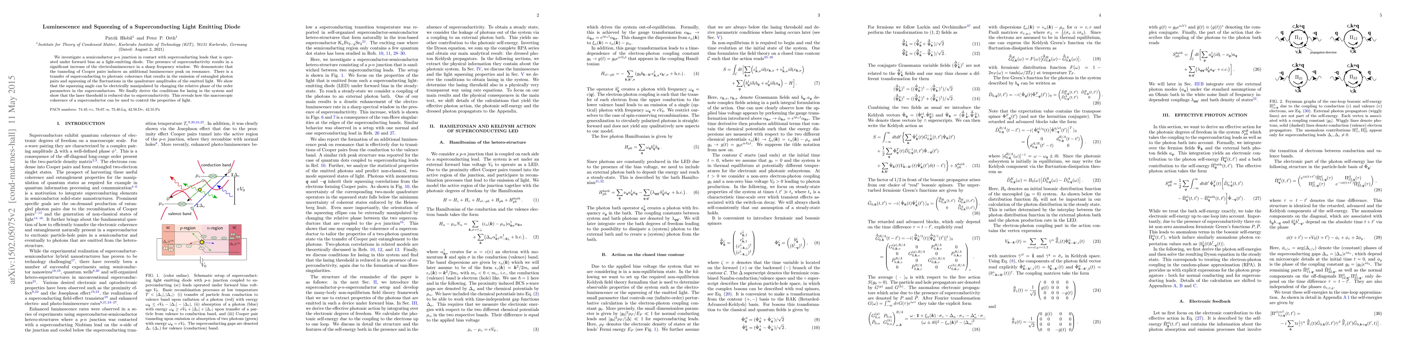 We investigate a semiconductor $p$-$n$ junction in contact with superconducting leads that is operated under forward bias as a light-emitting diode. The presence of superconductivity results in a significant increase of the electroluminescence in a certain frequency window. We demonstrate that the tunneling of Cooper pairs induces an additional luminescence peak on resonance. There is a transfer of superconducting to photonic coherence which results in the emission of entangled photon pairs and squeezing of the fluctuations in the quadrature amplitudes of the emitted light. The squeezing angle can be electrically manipulated by changing the relative phase of the order parameters in the superconductors. We finally derive the conditions for lasing in the system and show that the laser threshold is reduced due to superconductivity. This shows how macroscopic coherence of a superconductor can be used to control the properties of light.