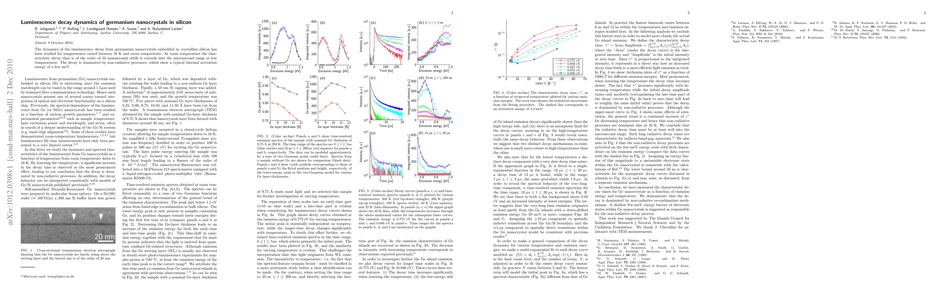 This study investigates the luminescence decay dynamics of germanium nanocrystals in silicon, revealing a characteristic decay time of 50 nanoseconds at room temperature and extending to microseconds at 16 K, dominated by non-radiative thermal activation processes.