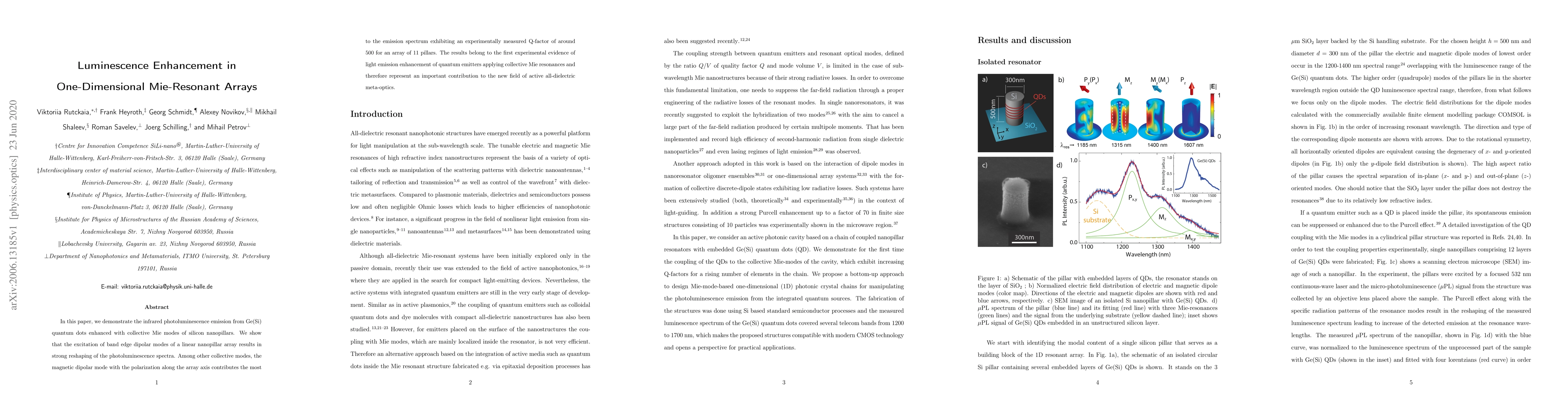 In this paper, we demonstrate the infrared photoluminescence emission from Ge(Si) quantum dots enhanced with collective Mie modes of silicon nanopillars. We show that the excitation of band edge dipolar modes of a linear nanopillar array results in strong reshaping of the photoluminescence spectra. Among other collective modes, the magnetic dipolar mode with the polarization along the array axis contributes the most to the emission spectrum exhibiting an experimentally measured Q-factor of around 500 for an array of 11 pillars. The results belong to the first experimental evidence of light emission enhancement of quantum emitters applying collective Mie resonances and therefore represent an important contribution to the new field of active all-dielectric meta-optics.