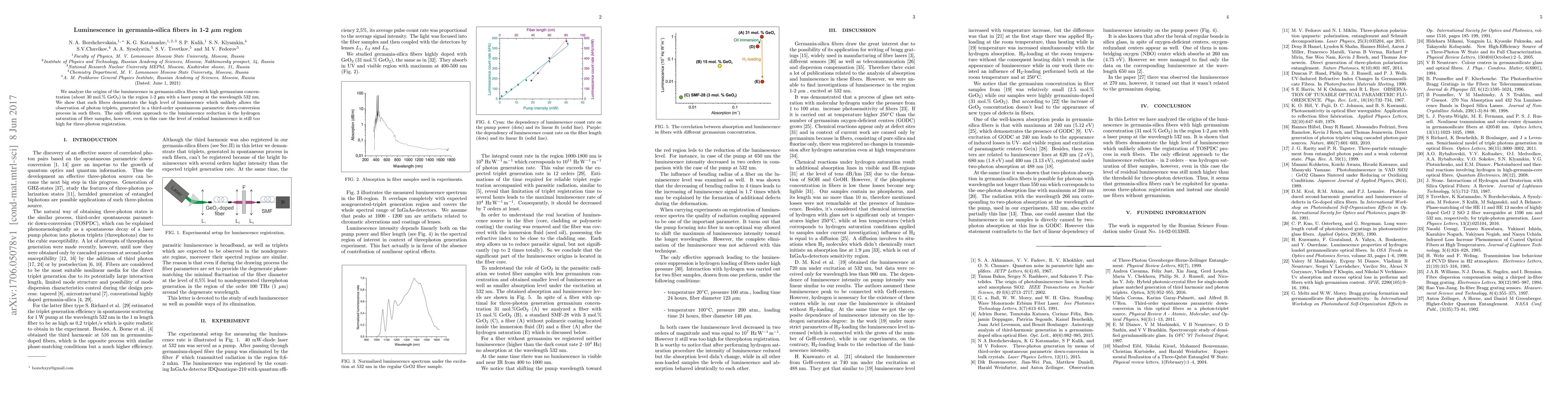 We analyze the origins of the luminescence in germania-silica fibers with high germanium concentration (about 30 mol. % GeO2) in the region 1-2 {\mu}m with a laser pump at the wavelength 532 nm. We show that such fibers demonstrate the high level of luminescence which unlikely allows the observation of photon triplets, generated in a third-order spontaneous parametric down-conversion process in such fibers. The only efficient approach to the luminescence reduction is the hydrogen saturation of fiber samples, however, even in this case the level of residual luminescence is still too high for three-photon registration.