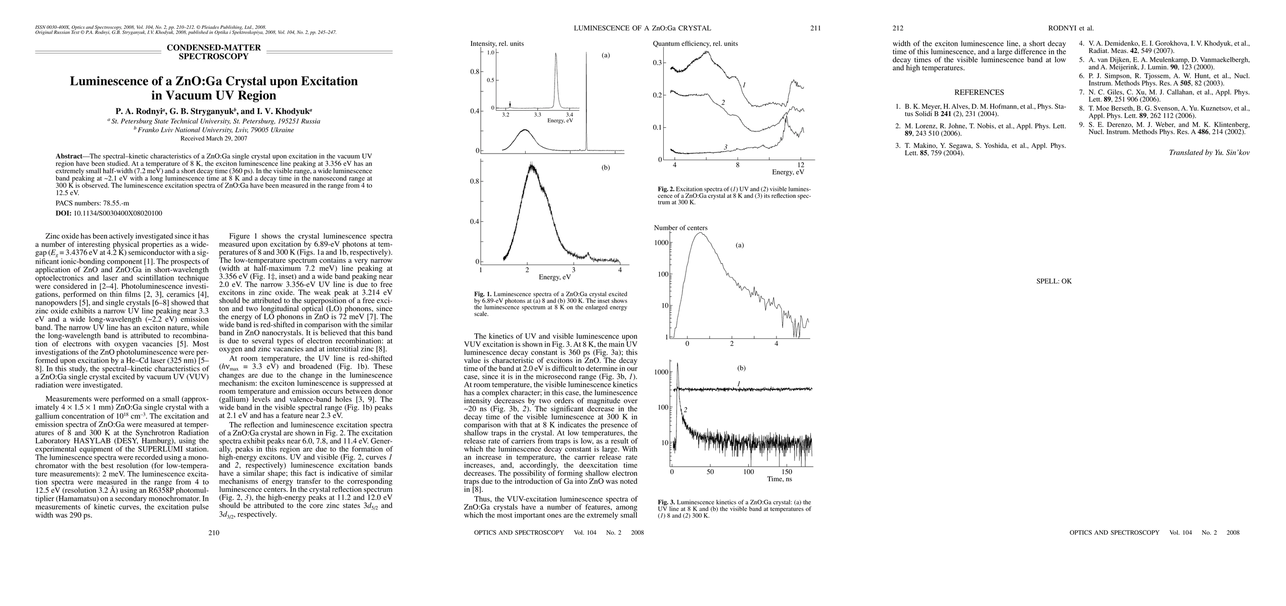 The spectral--kinetic characteristics of a ZnO:Ga single crystal upon excitation in the vacuum UV region have been studied. At a temperature of 8 K, the exciton luminescence line peaking at 3.356 eV has an extremely small half-width (7.2 meV) and a short decay time (360 ps). In the visible range, a wide luminescence band peaking at ~2.1 eV with a long luminescence time at 8 K and a decay time in the nanosecond range at 300 K is observed. The luminescence excitation spectra of ZnO:Ga have been measured in the range from 4 to 12.5 eV