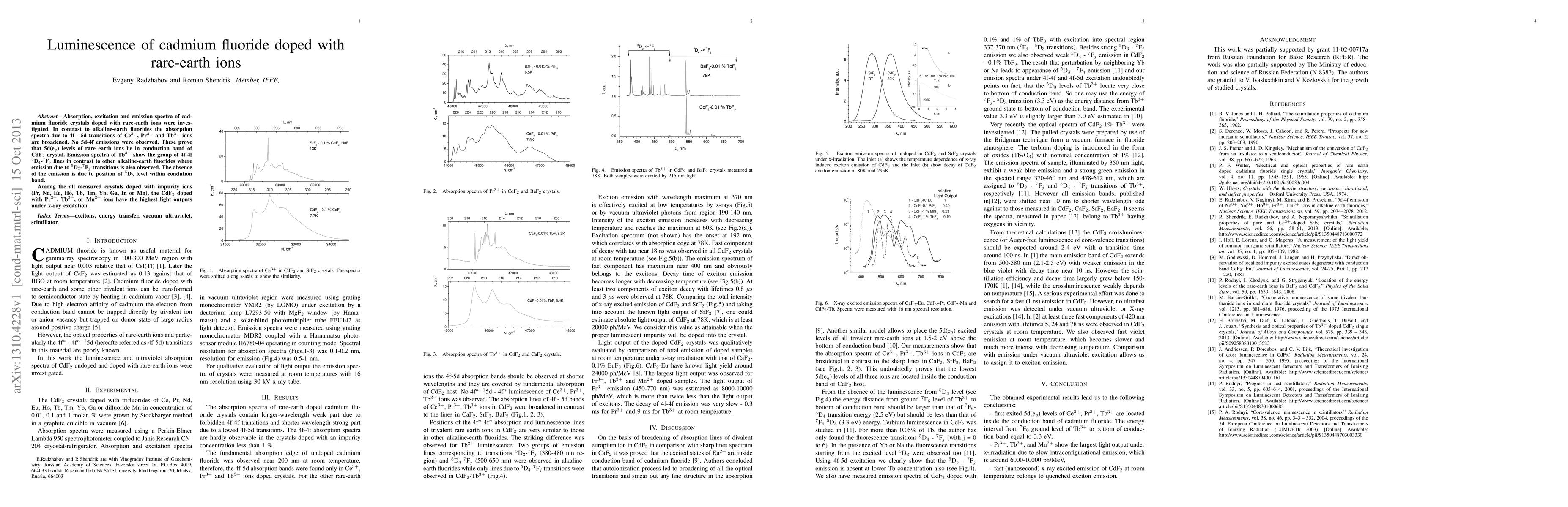 Absorption, excitation and emission spectra of cadmium fluoride crystals doped with rare-earth ions were investigated. In contrast to alkaline-earth fluorides the absorption spectra due to 4f - 5d transitions of Ce$^{3+}$, Pr$^{3+}$ and Tb$^{3+}$ ions are broadened. No 5d-4f emissions were observed. These prove that 5d(e$_g$) levels of rare earth ions lie in conduction band of CdF$_2$ crystal. Emission spectra of Tb$^{3+}$ show the group of 4f-4f $^5$D$_4$-$^7$F$_j$ lines in contrast to other alkaline-earth fluorides where emission due to $^5$D$_3$-$^7$F$_j$ transitions is also observed. The absence of the emission is due to position of $^5$D$_3$ level within condution band. Among the all measured crystals doped with impurity ions (Pr, Nd, Eu, Ho, Tb, Tm, Yb, Ga, In or Mn), the CdF$_2$ doped with Pr$^{3+}$, Tb$^{3+}$, or Mn$^{2+}$ ions have the highest light outputs under x-ray excitation.