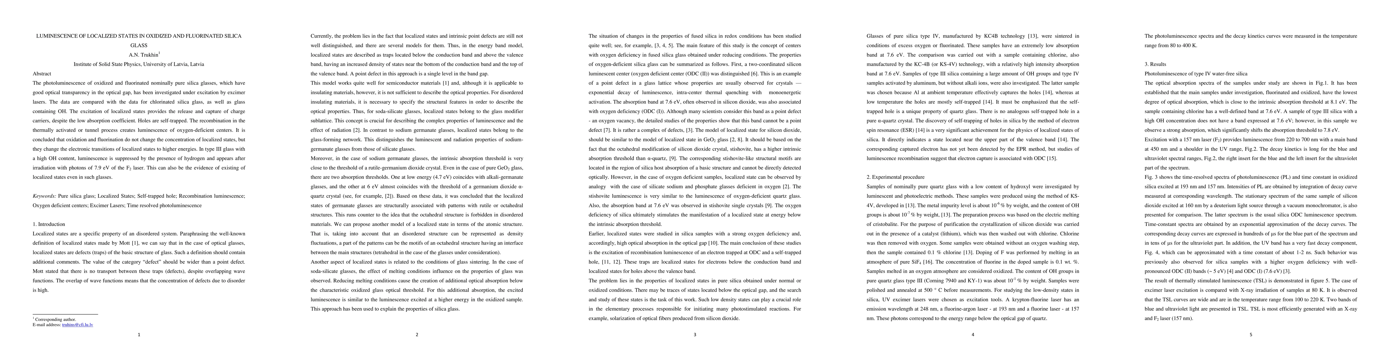 This study investigates the photoluminescence of oxidized and fluorinated silica glasses, revealing that while oxidation and fluorination shift electronic transitions to higher energies, they do not alter the concentration of localized states. Luminescence in type III glass with high OH content is suppressed by hydrogen but reappears after high-energy F2 laser irradiation, indicating the presence of localized states.