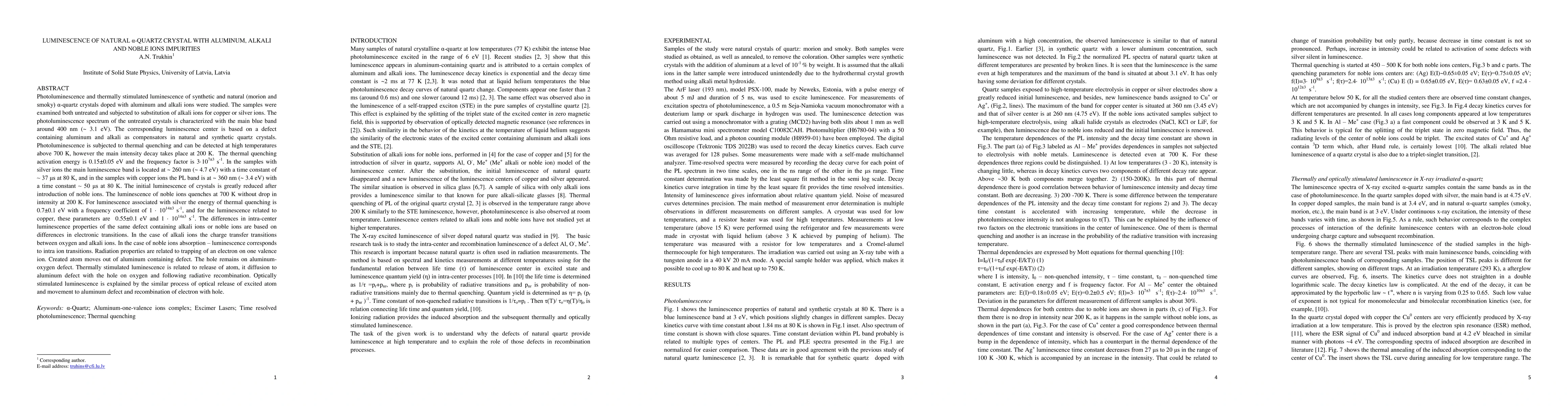 Photoluminescence and thermally stimulated luminescence of synthetic and natural (morion and smoky) $\alpha$-quartz crystals doped with aluminum and alkali ions were studied. The photoluminescence spectrum is characterized with the main blue band around 400 nm (~ 3.1 eV). The corresponding luminescence center is based on a defect containing aluminum and alkali as compensators in natural and synthetic quartz crystals. Photoluminescence can be detected at high temperatures above 700 K. The thermal quenching activation energy is 0.15 eV and the frequency factor is 3 10$^7$ s$^{-1}$. In the samples with silver ions the main luminescence band is located at ~ 260 nm (~ 4.7 eV) with a time constant of ~ 37 $\mu$s at 80 K, and in the samples with copper ions the PL band is at ~ 360 nm (~ 3.4 eV) with a time constant ~ 50 {\mu}s at 80 K. For luminescence associated with silver the energy of thermal quenching is 0.7 eV with a frequency coefficient of 1 10$^{14}$ s$^{-1}$, and for the luminescence related to copper, these parameters are 0.55 eV and 10$^{14}$ s$^{-1}$. The differences in intra-center luminescence properties of the same defect containing alkali ions or noble ions are based on differences in electronic transitions. In the case of alkali ions the charge transfer transitions between oxygen and alkali ions. In the case of noble ions absorption-luminescence corresponds to intra ion transitions. Radiation properties are related to trapping of an electron on one valence ion. Created atom moves out of aluminum containing defect. The hole remains on aluminum-oxygen defect. Thermally stimulated luminescence is related to release of atom, it diffusion to aluminum defect with the hole on oxygen and following radiative recombination.
