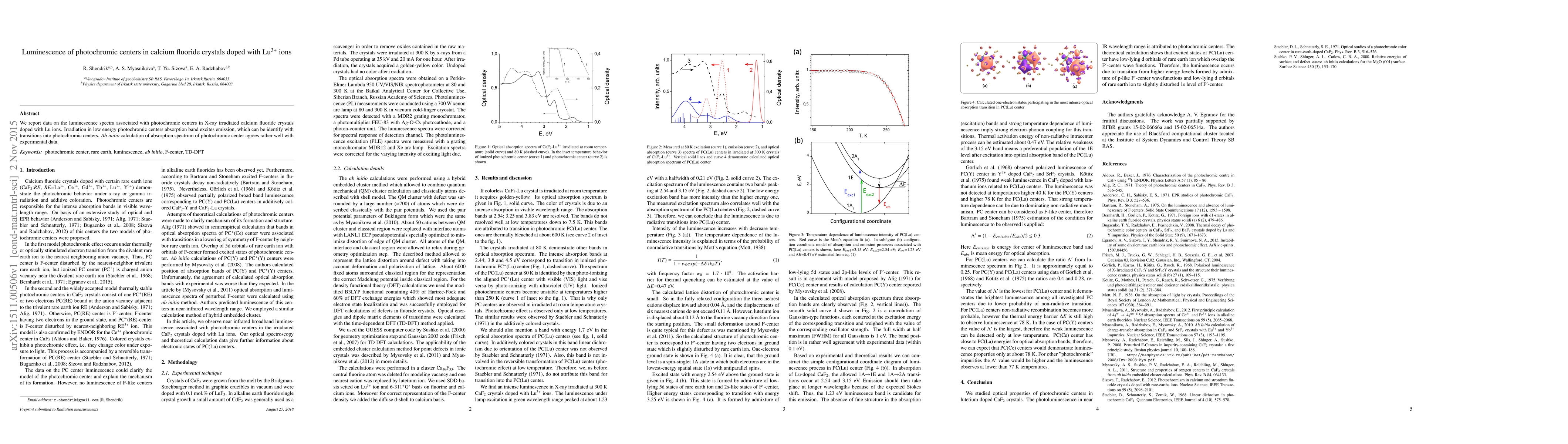 We report data on the luminescence spectra associated with photochromic centers in X-ray irradiated calcium fluoride crystals doped with Lu ions. Irradiation in low energy photochromic centers absorption band excites emission, which can be identify with transitions into photochromic centers. Ab initio calculation of absorption spectrum of photochromic center agrees rather well with experimental data.