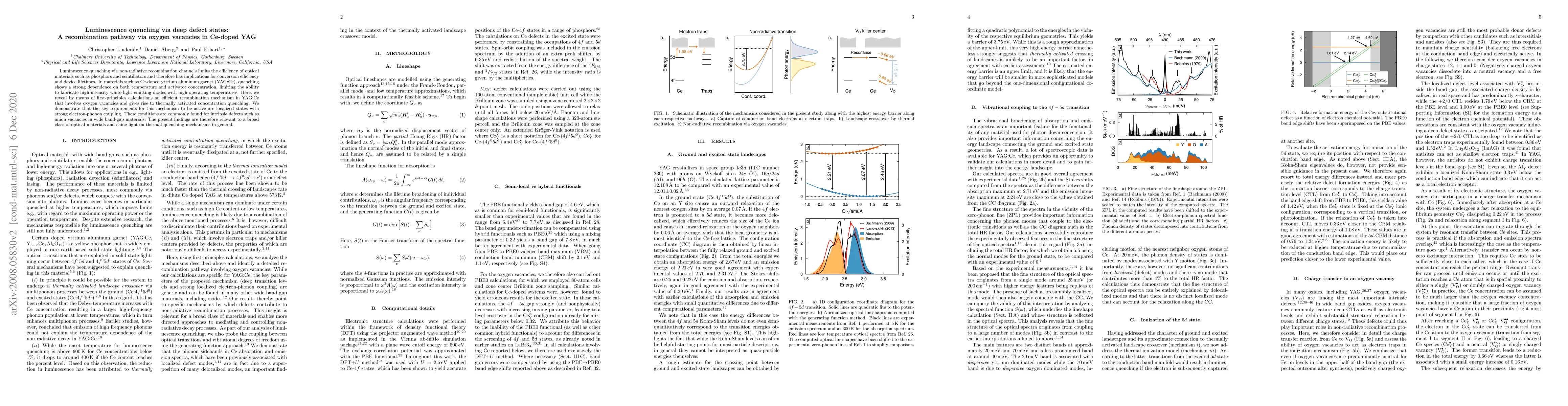 This paper investigates the luminescence quenching in Ce-doped yttrium aluminum garnet (YAG:Ce) through non-radiative recombination via oxygen vacancies, revealing a thermally activated mechanism dependent on activator concentration and temperature. First-principles calculations show that strong electron-phonon coupling in localized defect states is crucial for this quenching mechanism.