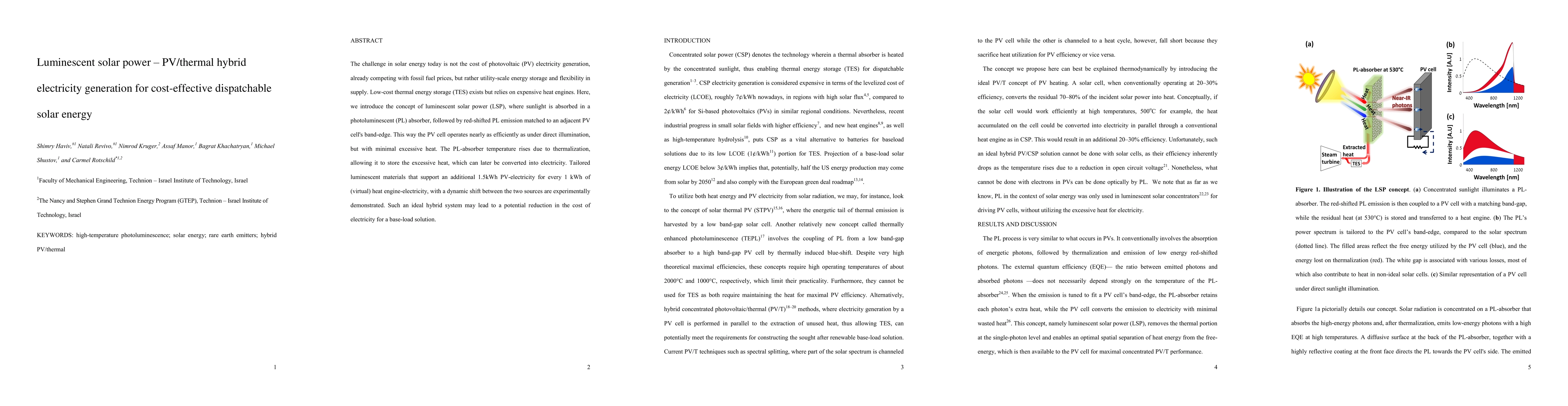 This paper proposes luminescent solar power (LSP) as a hybrid PV/thermal system to enhance solar energy storage and flexibility. The concept involves photoluminescent materials that absorb sunlight, emit red-shifted light to boost PV efficiency, and store excess heat for later electricity generation, potentially reducing overall solar energy costs.